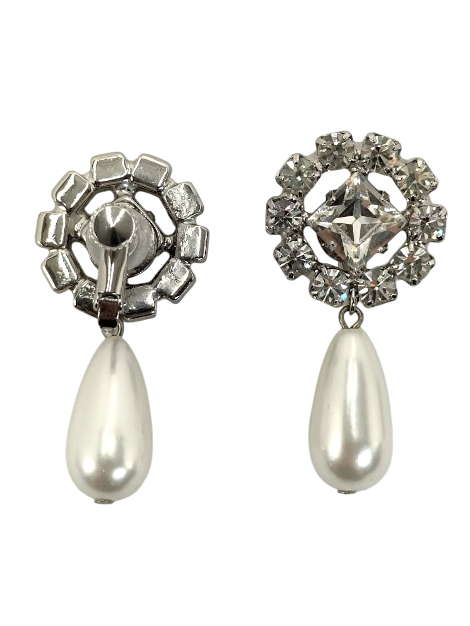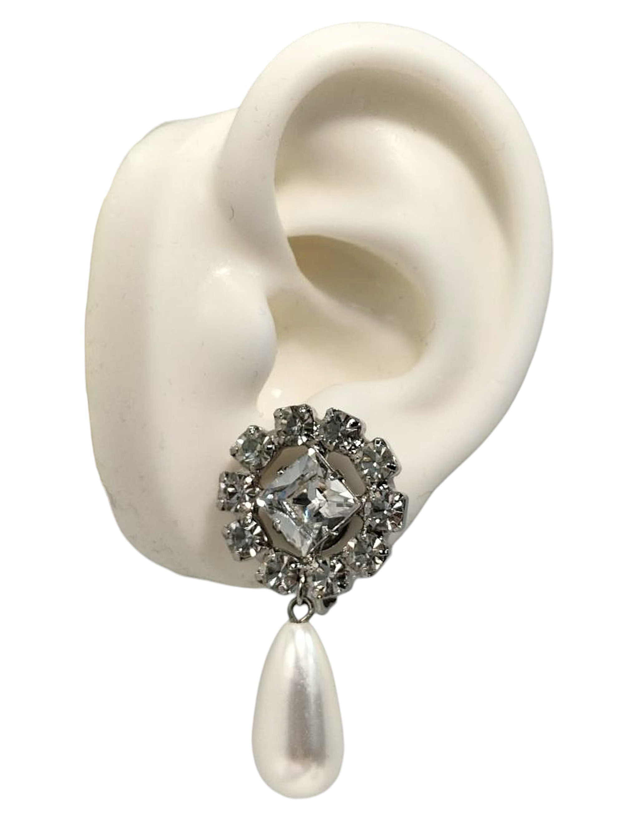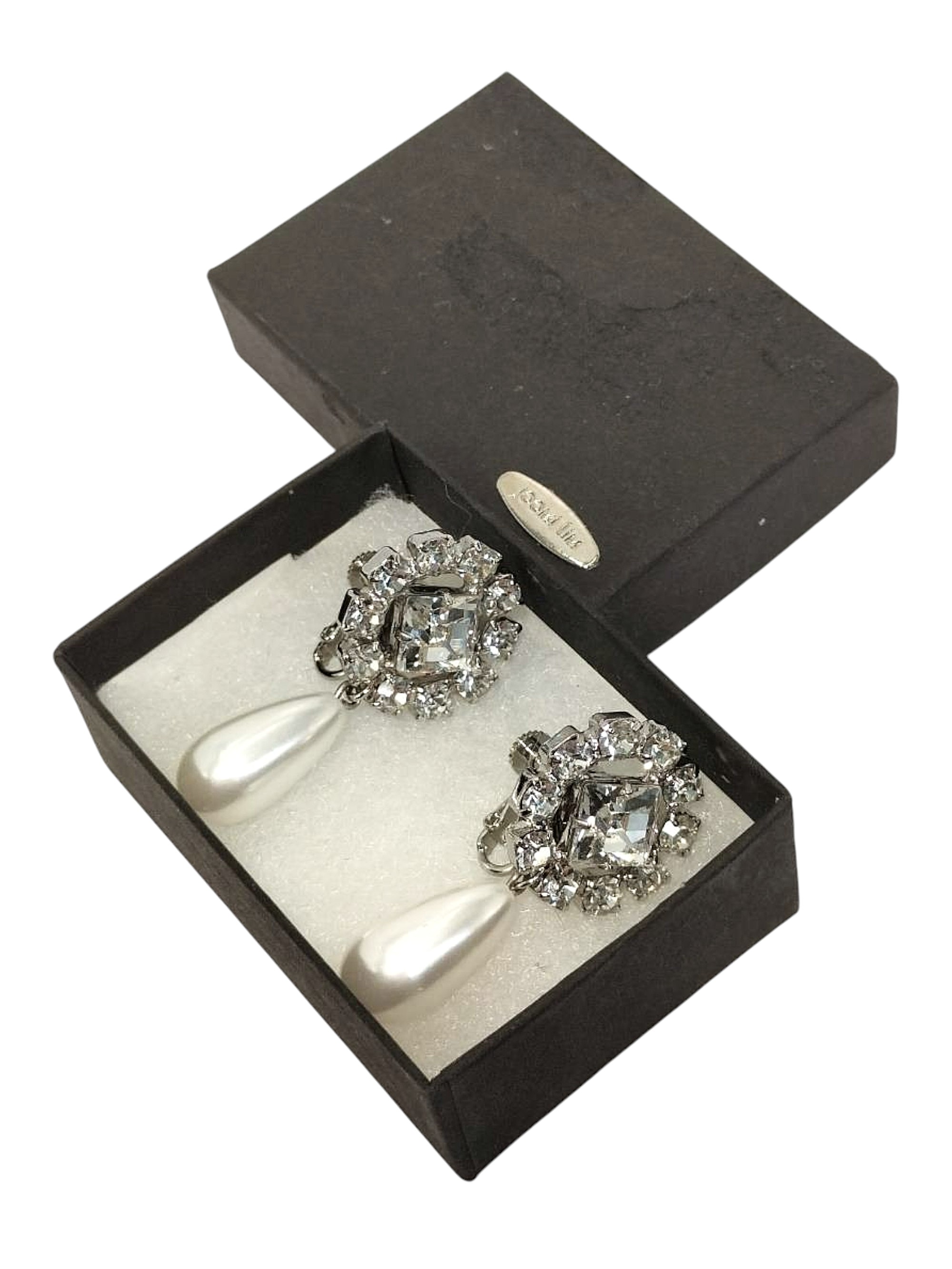 アイテム:シズクパール付きビジューイヤリング 素材:メタル・ガラス・樹脂パール カラー:シルバー・クリスタル・ホワイトパール 全長:約4㎝