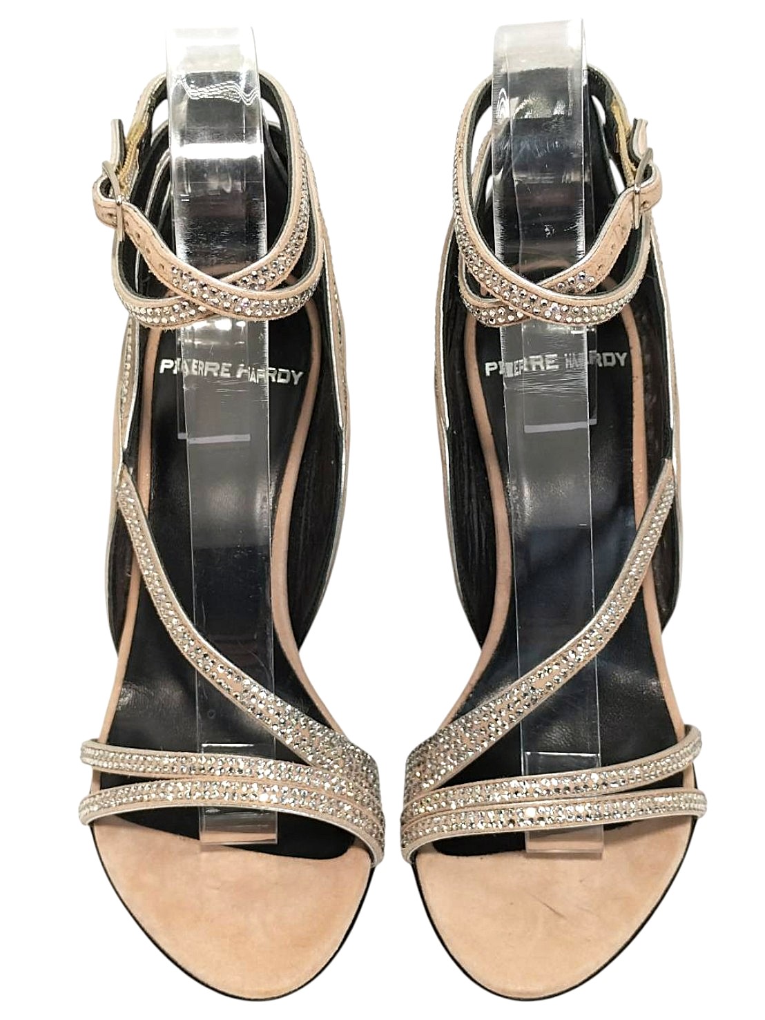 メモ | アイテム:アンクルクロスストラップサンダル 素材:レザー・ガラス ヒール:10.5cm カラー:ピンクベージュ・クリスタル ※金具シルバー |