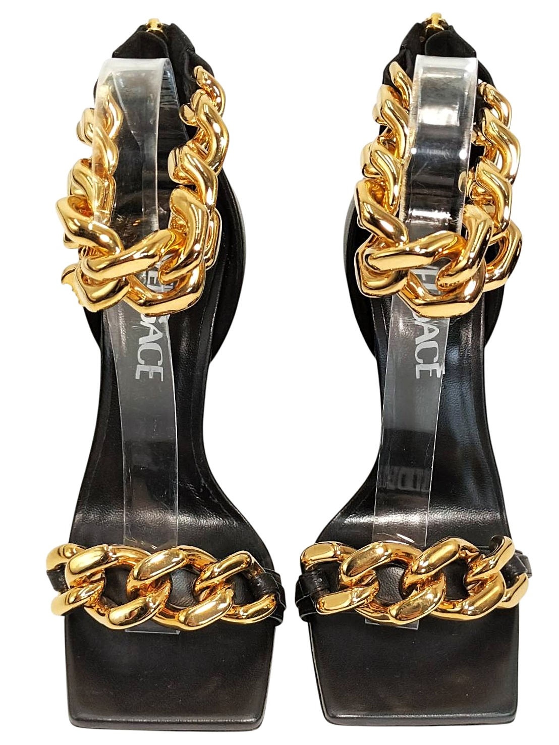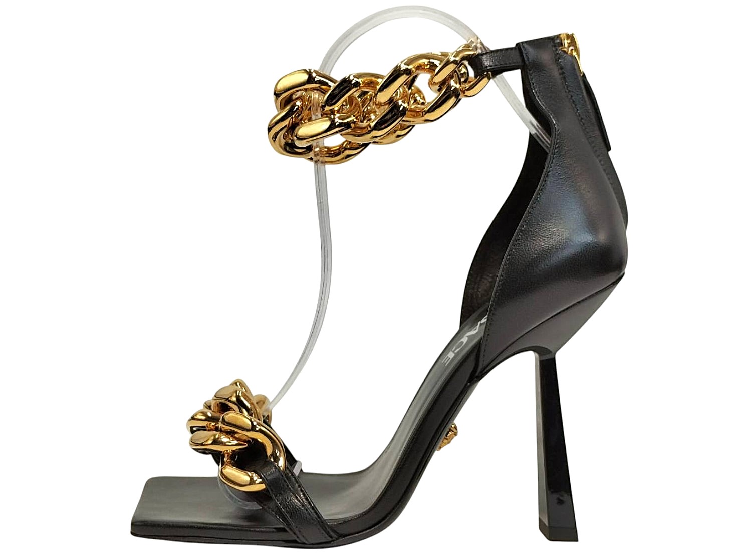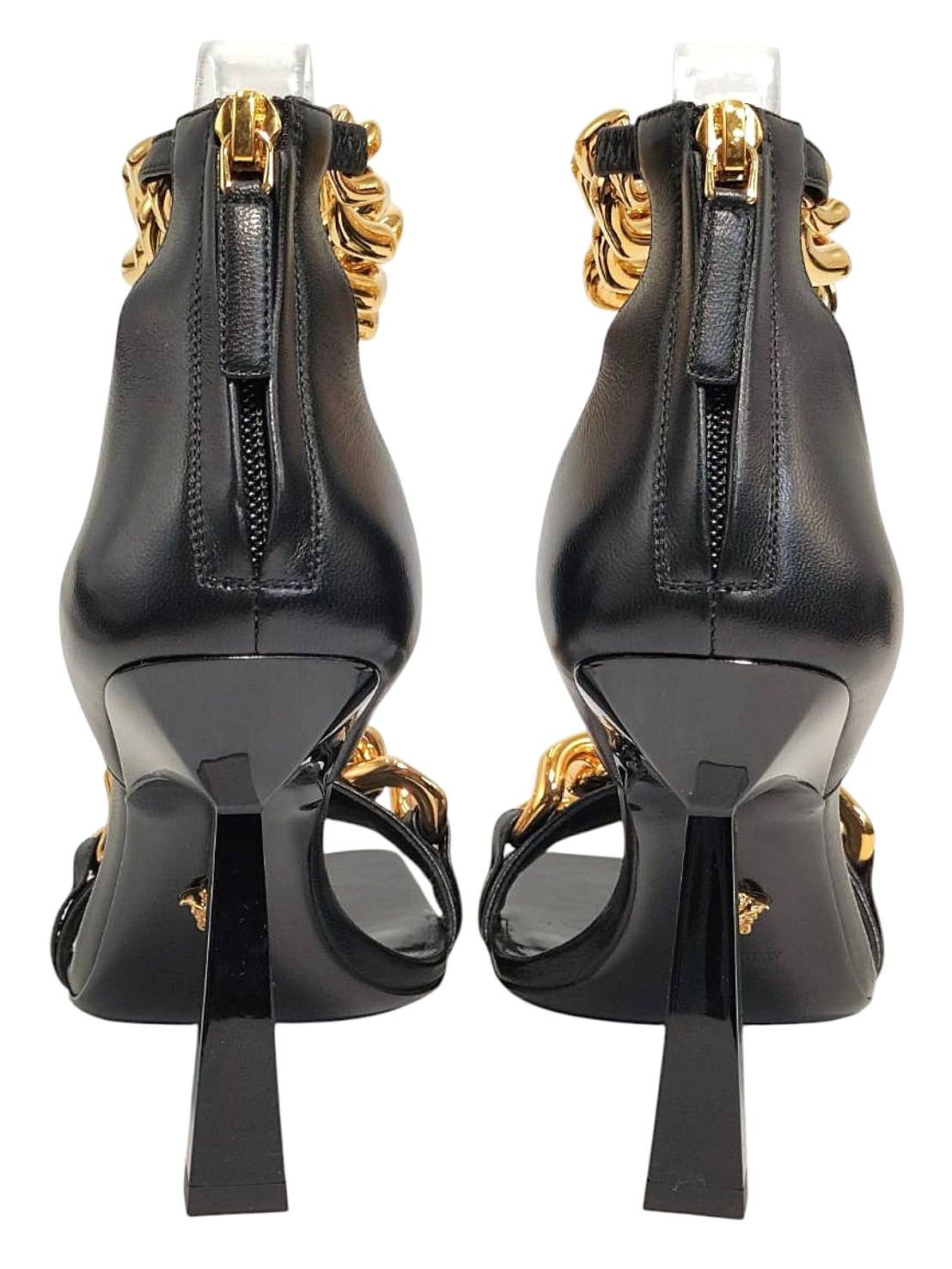 アイテム:チェーンデザインハイヒールサンダル 素材:レザー・メタル ヒール:10.5㎝ 全長:約20㎝ カラー:ブラック・ゴールド ※金具ゴールド