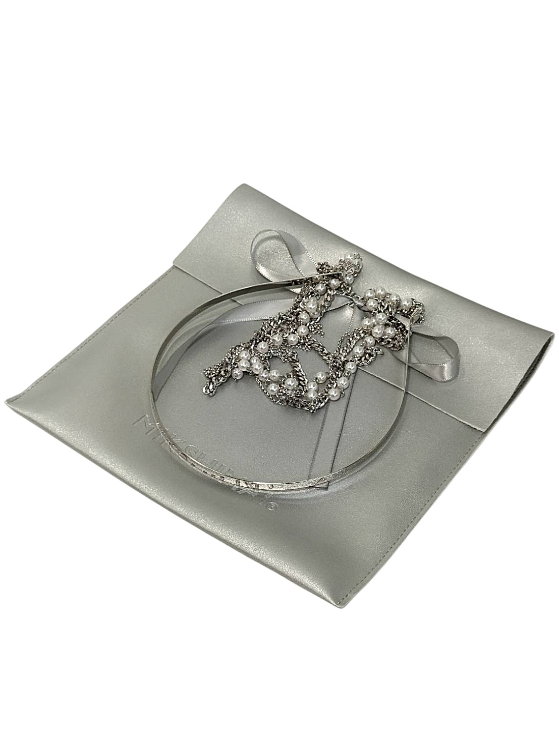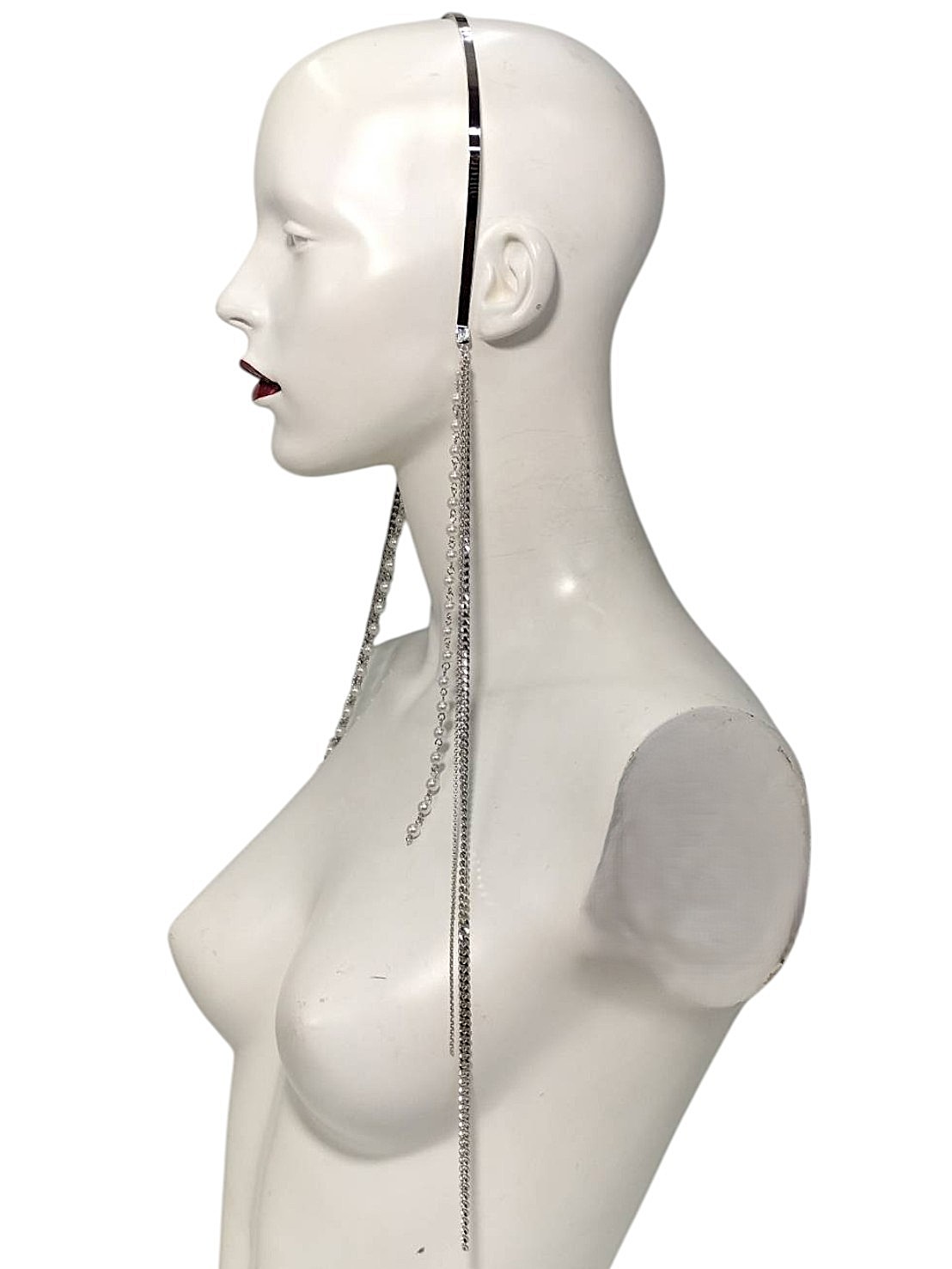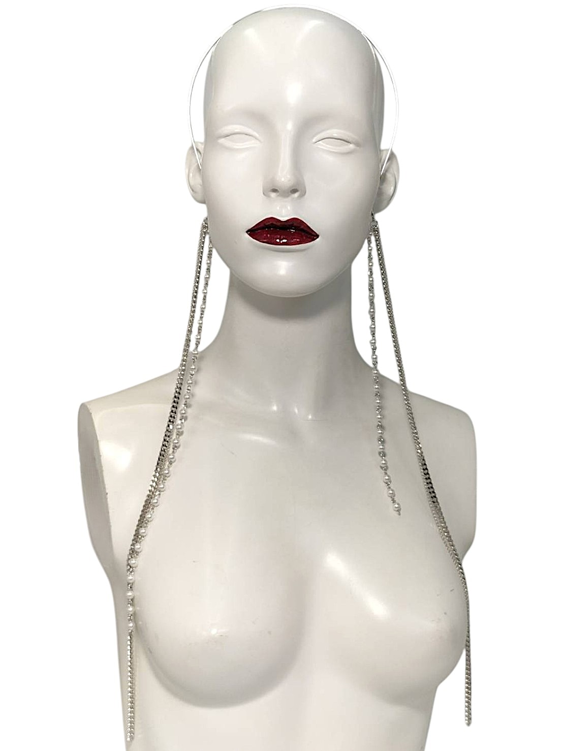 アイテム:フリンジデザインカチューシャ 素材:メタル・チェーン・樹脂パール カラー:シルバー・ホワイトパール
