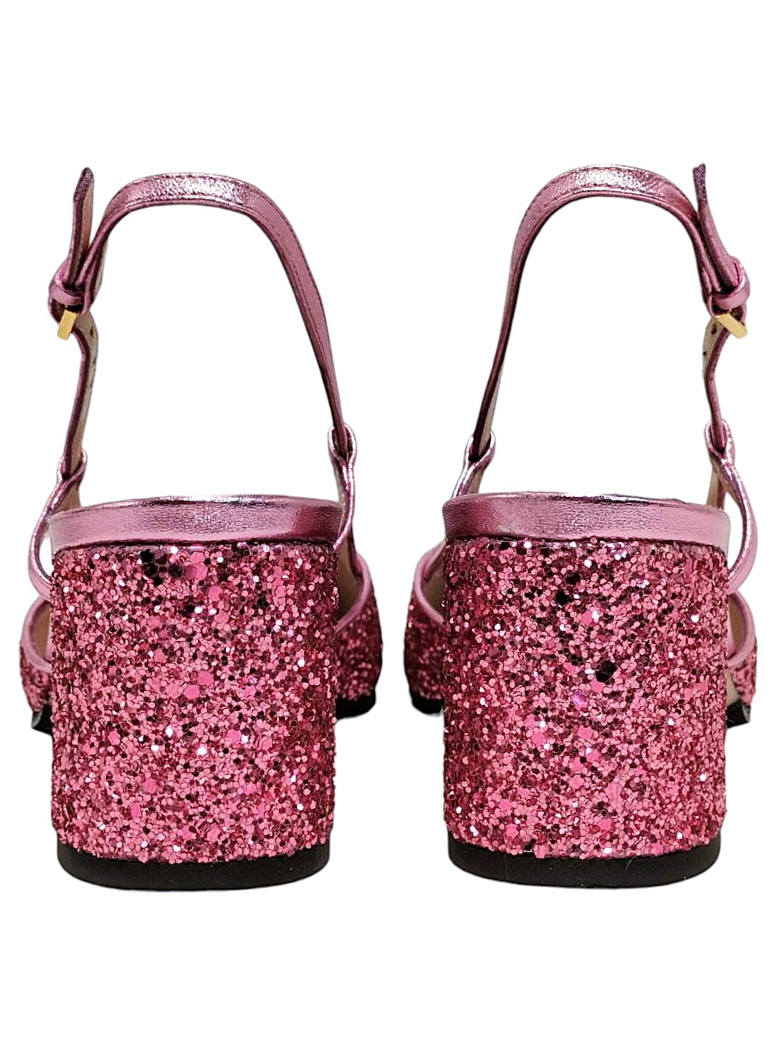 アイテム:金具デザイン付きグリッターサンダル 素材:グリッター・箔レザー・メタル ヒール:約6.5㎝ カラー:メタリックピンク・ゴールド