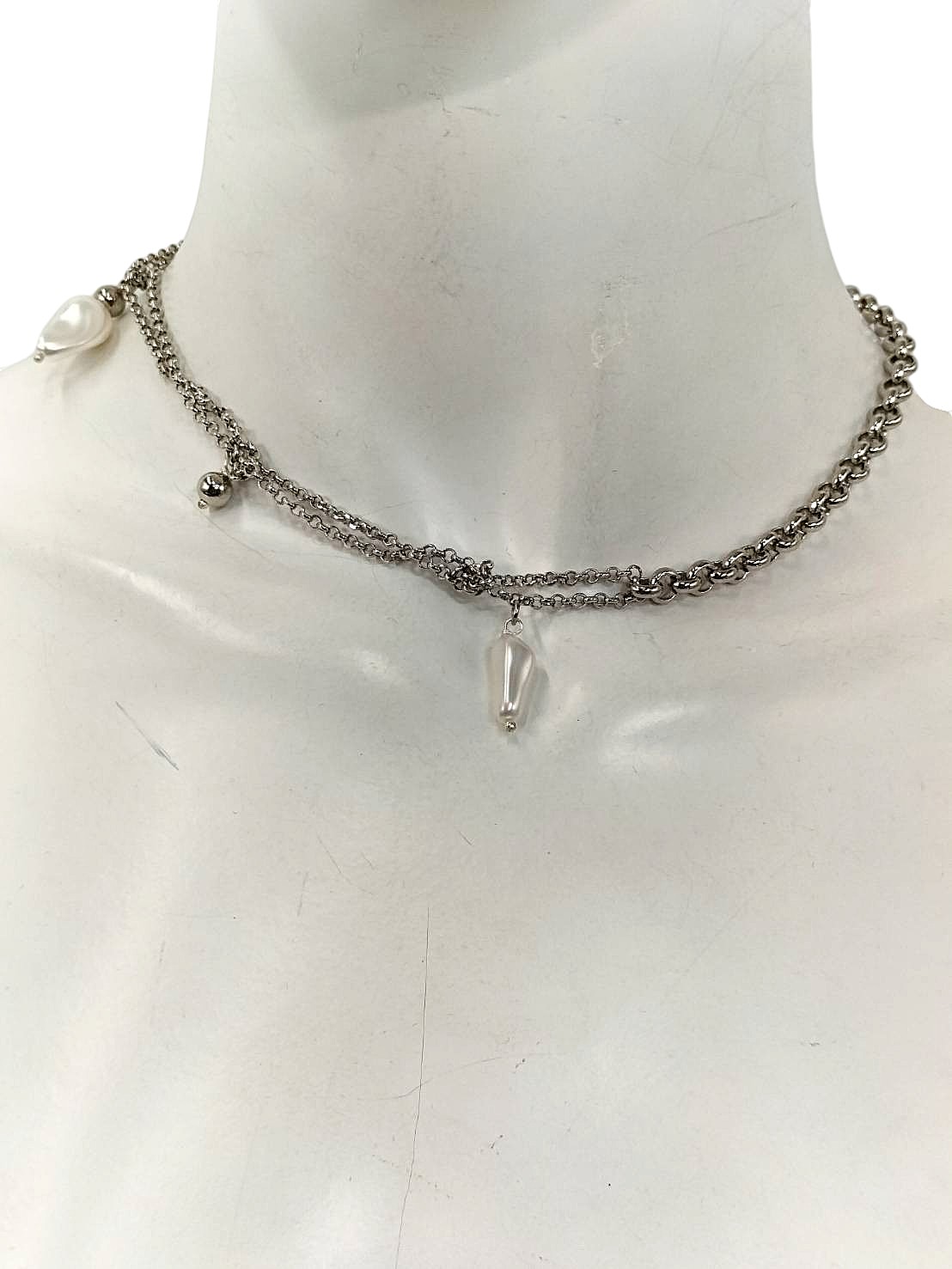 | メモ | アイテム:変形パールデザインネックレス 素材:メタル・樹脂パール 全長:39㎝ カラー:シルバー・ホワイトパール ※AC9999192と同型 |