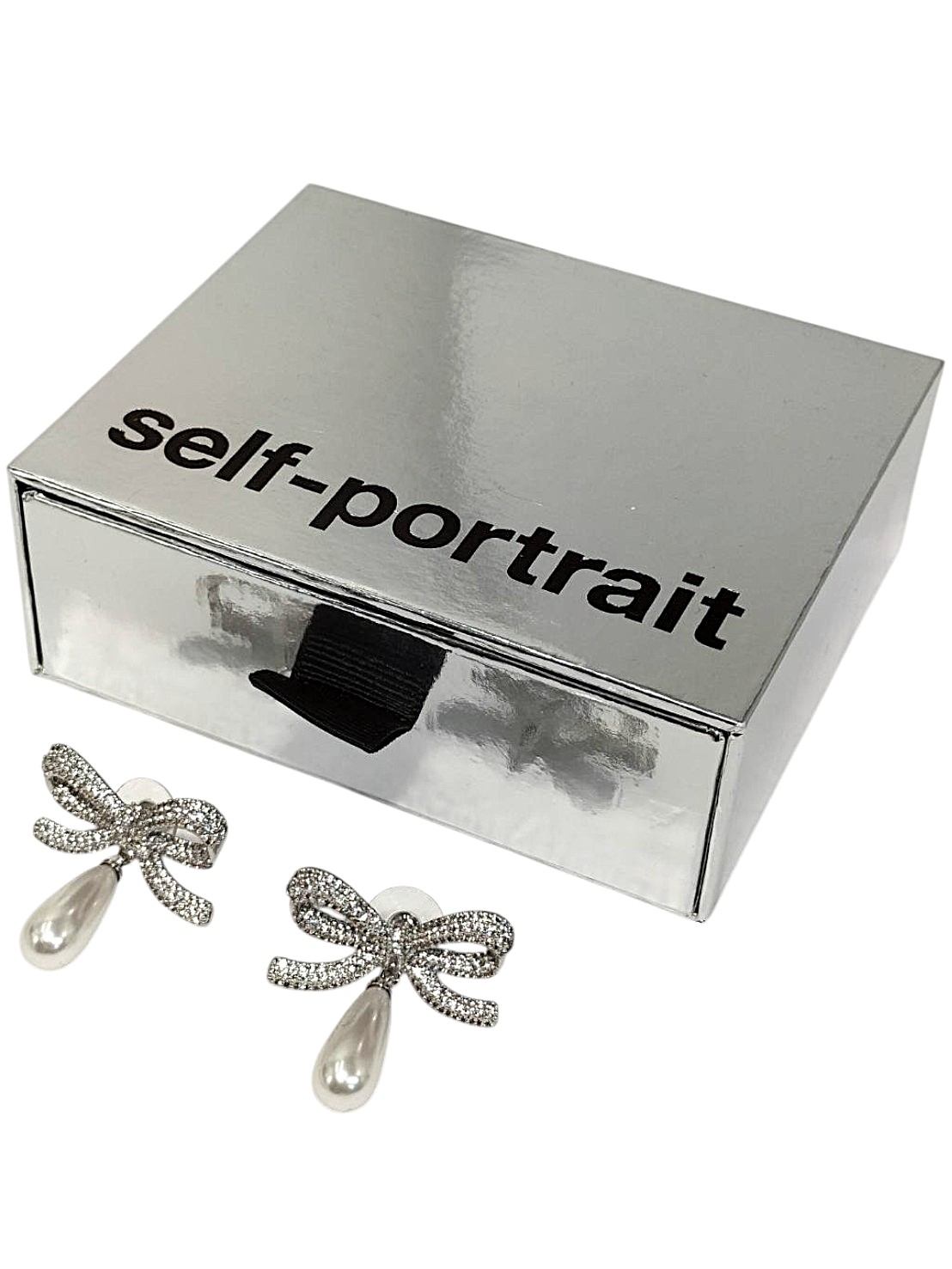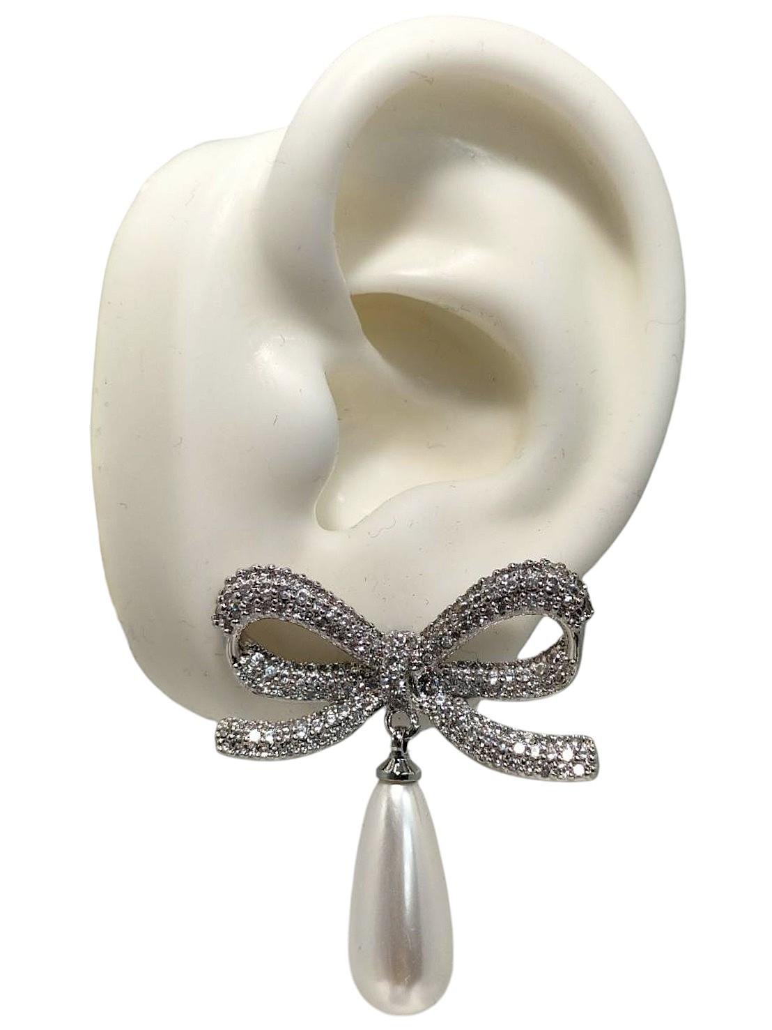 | メモ | アイテム:シルクパール付きリボンデザインピアス 素材:樹脂パール・メタル・ガラス カラー:ホワイトパール・シルバー・クリスタル 全長:約3.8㎝ |