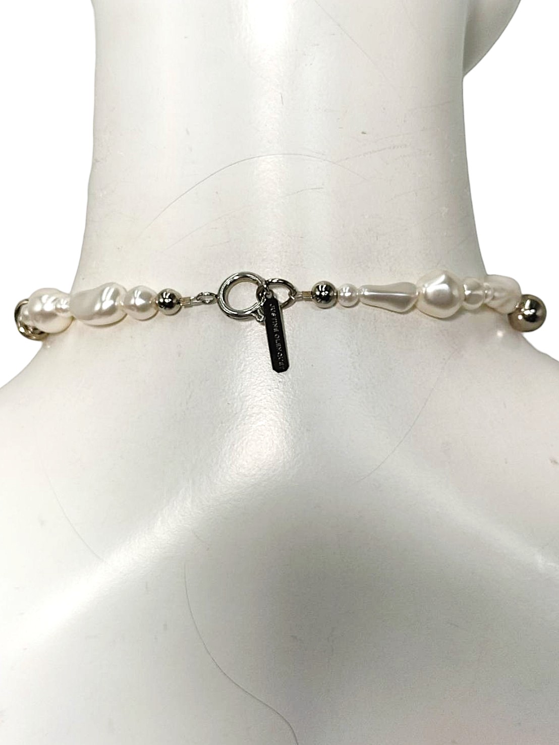 | メモ | アイテム:変形パール&メタルミックスデザインネックレス 素材:メタル・樹脂パール 全長:36㎝ カラー:シルバー・ホワイトパール |