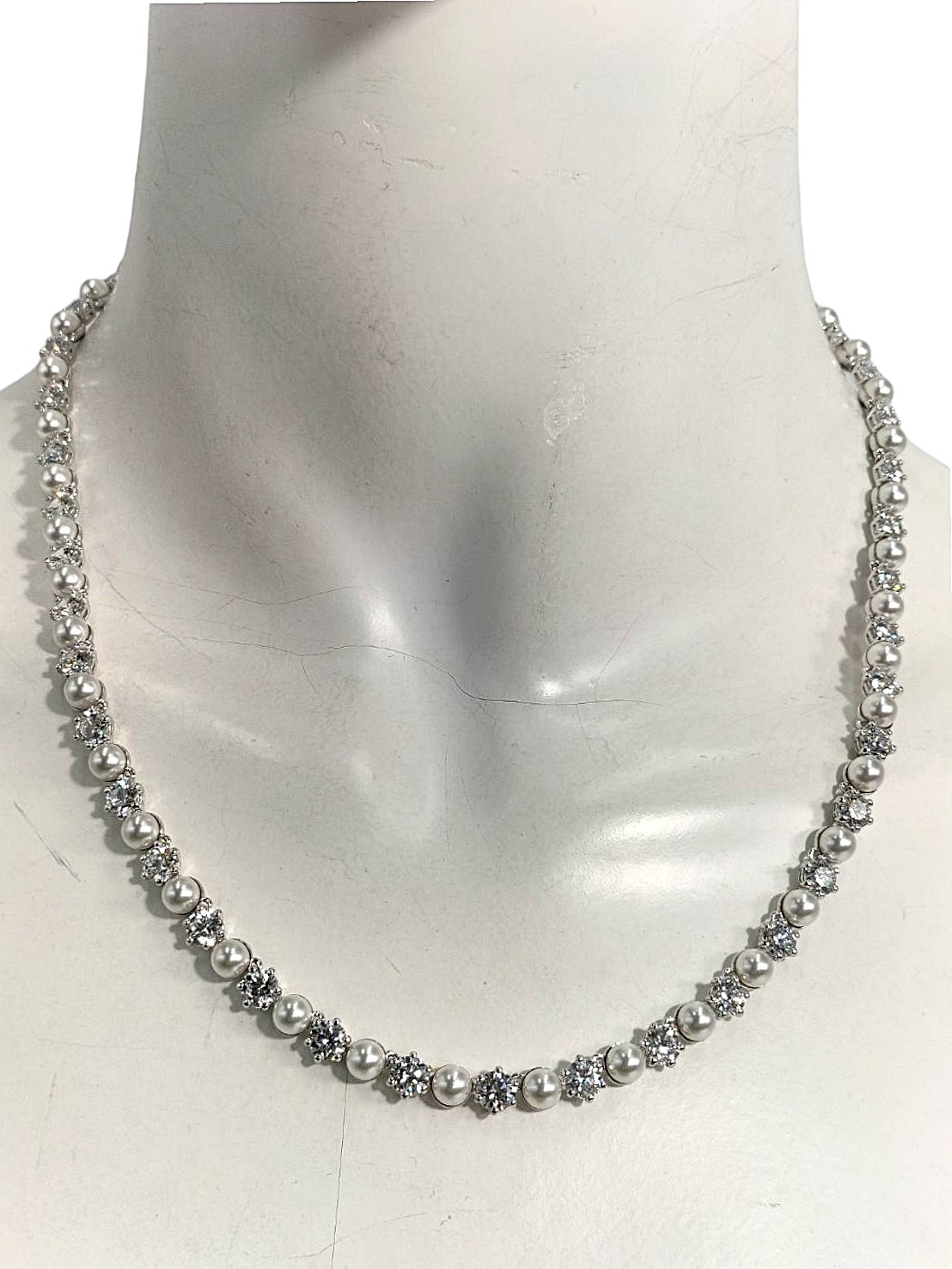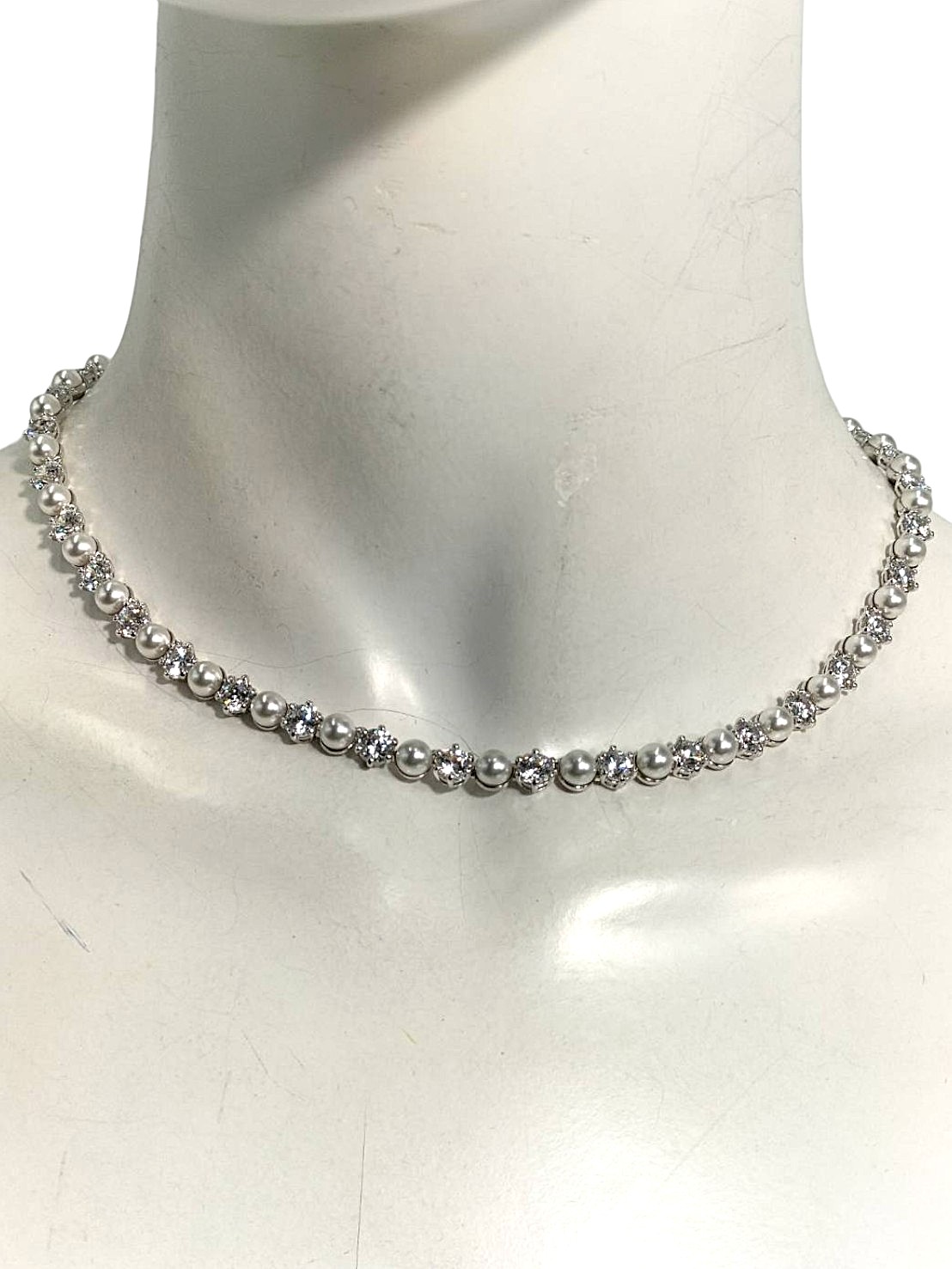 アイテム:パール&ビジューデザインネックレス 全長:約39㎝ 素材:メタル・ガラス・ガラスパール カラー:シルバー・クリスタル・ホワイトパール