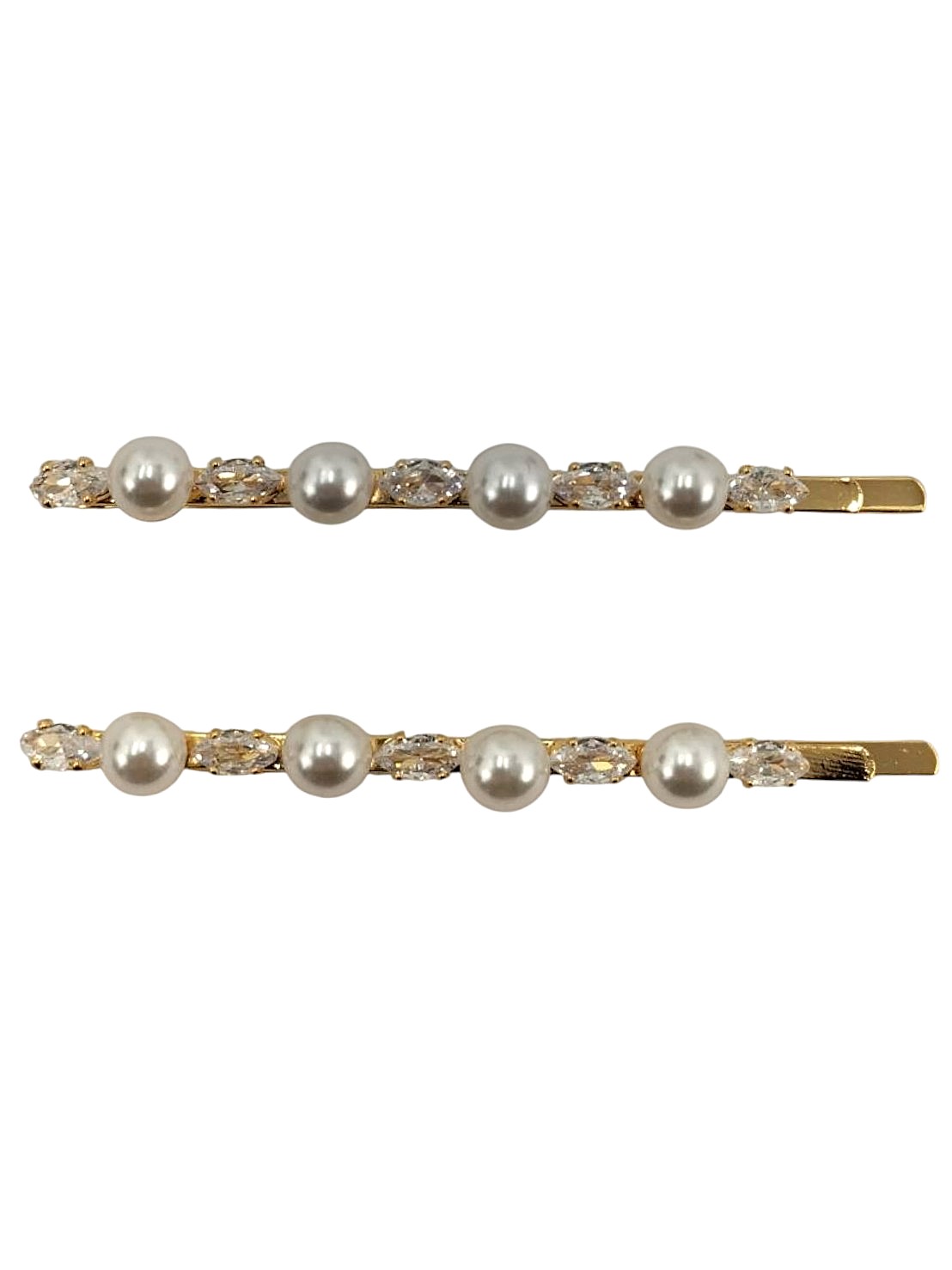 アイテム:パールミックスストーンヘアピン2ヶセット 素材:ガラスパール・ジルコニア・メタル カラー:ゴールド・クリア・ホワイト 全長:約5.5㎝(装飾部分)