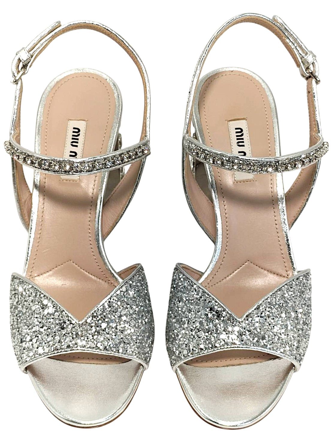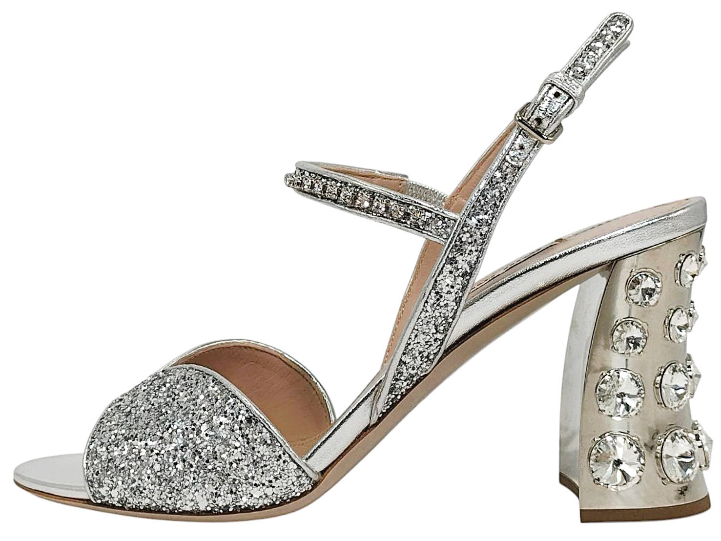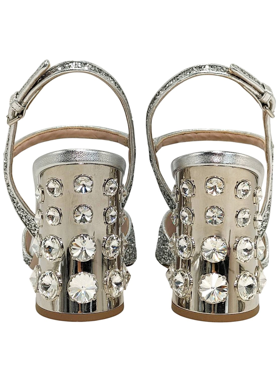 アイテム:ビジューデザインヒールグリッターサンダル 素材:レザー・グリッター・メタル・ガラス ヒール:約8.5m ※金具シルバー