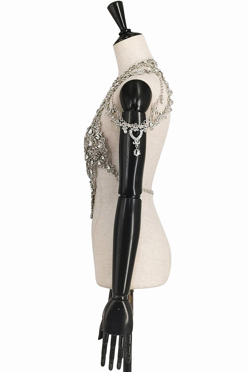 アイテム:ビジュー付きボディーアクセサリー・ボディーチェーン・チェーンハーネス 素材:メタル・ガラス カラー:シルバー・クリスタル