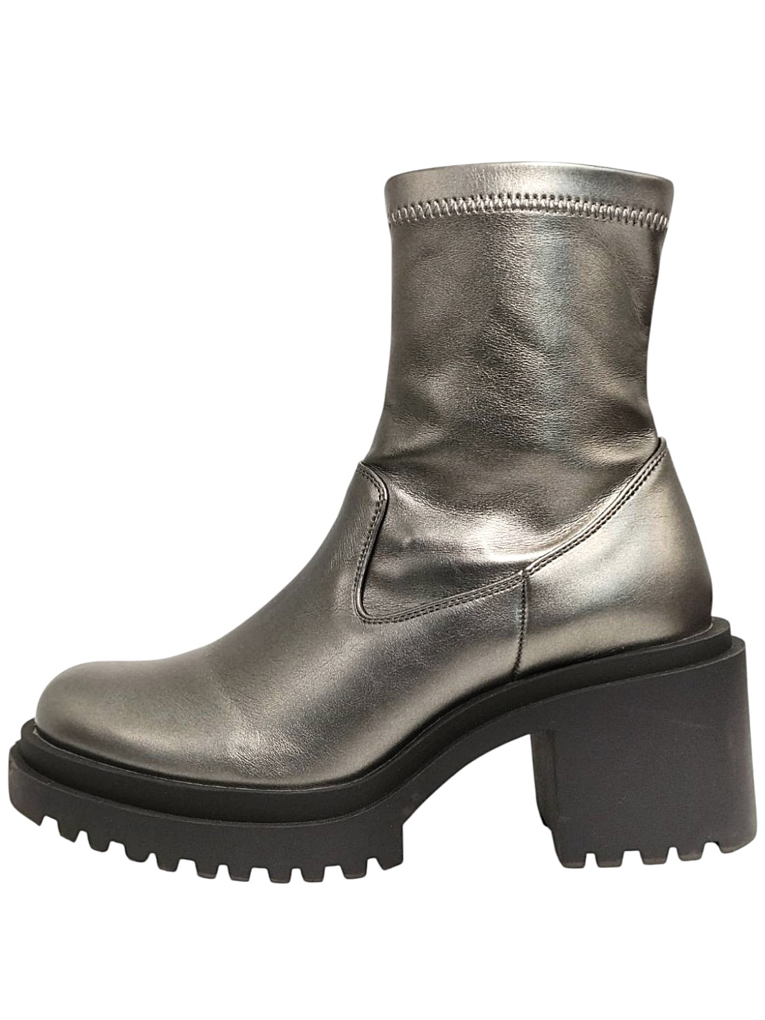 アイテム:プラットフォームショートブーツ 素材:フェイクレザー サイズ:L(24~24.5cm) ヒール:約8㎝ ストーム(前):約3cm 全長:約24㎝ カラー:メタリックグレー