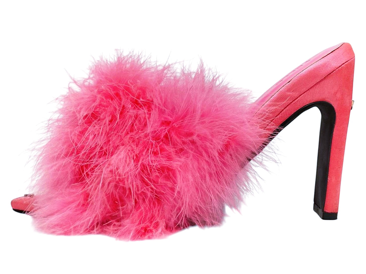 アイテム:フェザー付きミュールサンダル 素材:フェザー・サテン生地 サイズ:XL(25~25.5cm) ヒール:約11.5㎝ カラー:ネオンピンク ※内側黒い汚れあり