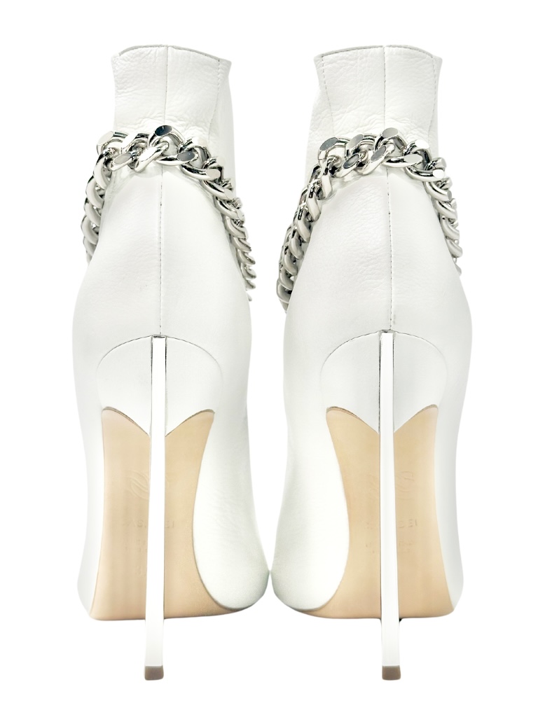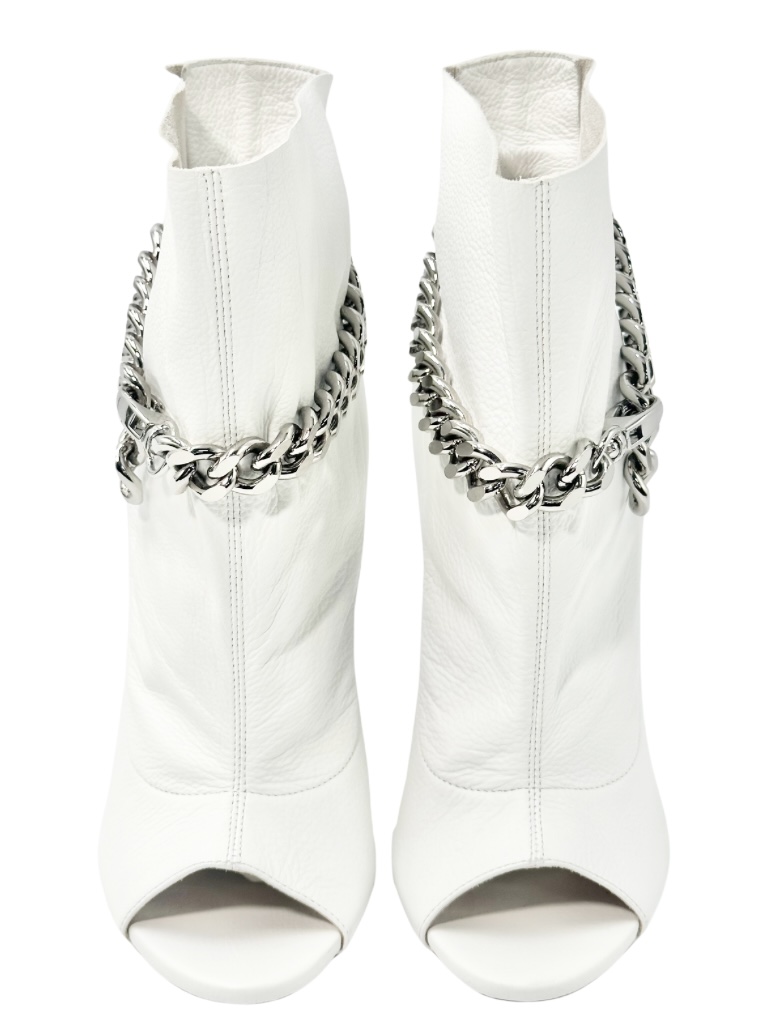 | メモ | アイテム:チェーン付きオープントゥヒールブーツ 素材:レザー・メタル ヒール:約12㎝ 全長:約22㎝ カラー:ホワイト・シルバー ※金具シルバー ※SH558414(37サイズあり) |