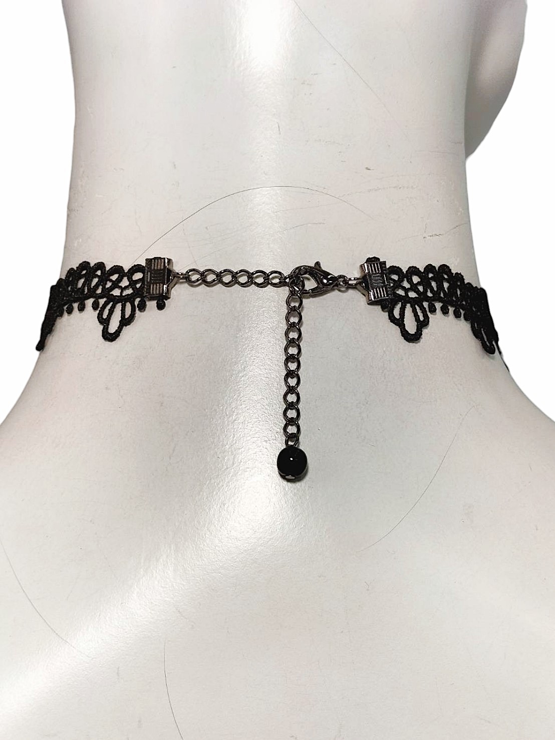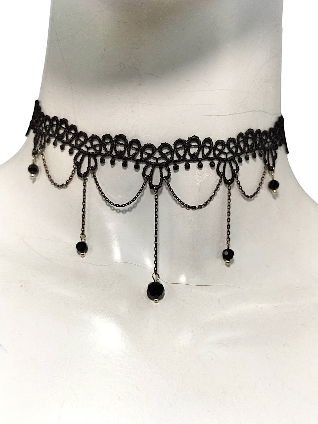 アイテム:ビーズ付きレースチョーカー 素材:レース・ガラス・チェーン 全長:約28.5㎝ カラー:ブラック・ブラックニッケル