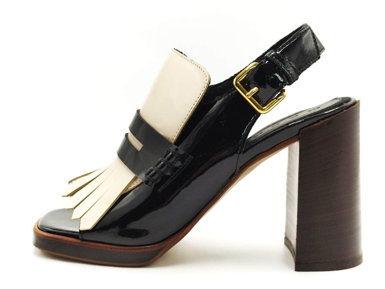 アイテム:ローファー風サンダル 素材:レザー・エナメル ヒール:10.5㎝ストーム(前):2.3cm カラー:ブラック&アイボリー