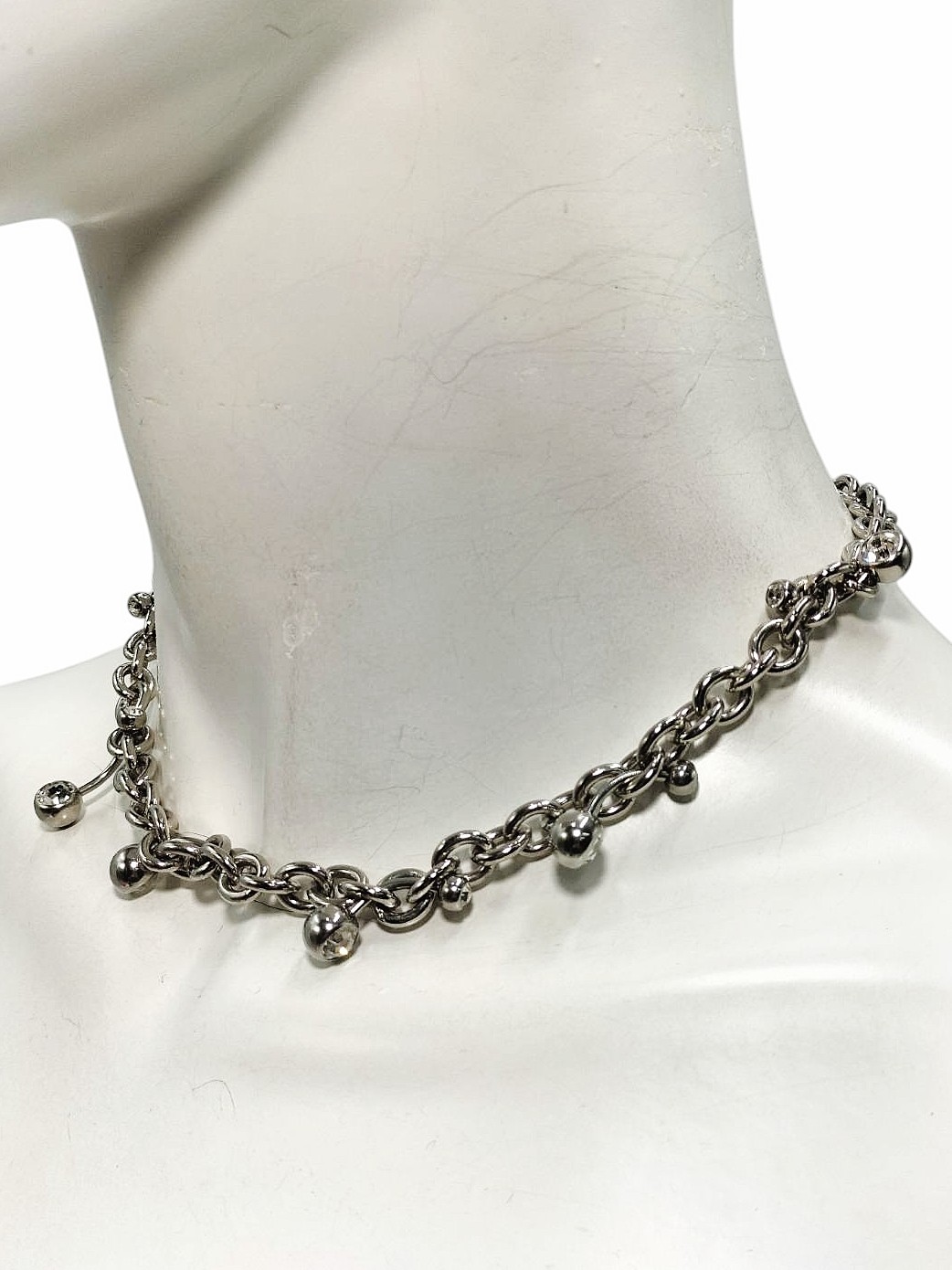 | メモ | アイテム:ビジュー付きメタルチェーンチョーカー 素材:メタル・チェーン・ガラス 全長:約38㎝ カラー:シルバー・クリスタル |