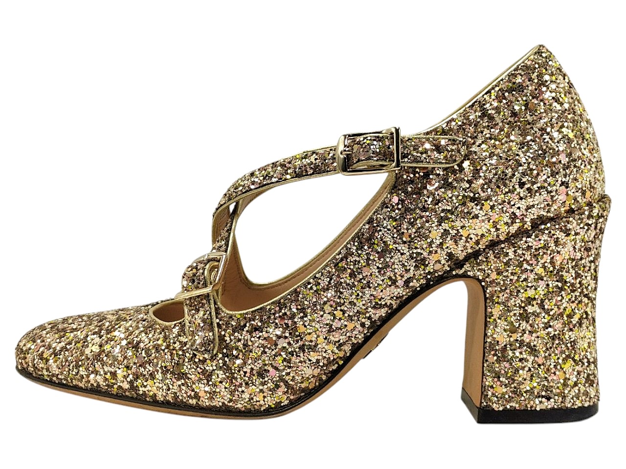 メモ | アイテム:クロスベルトストラップシューズ 素材:グリッター・レザー ヒール:7.5㎝ カラー:ゴールド ※金具ゴールド |