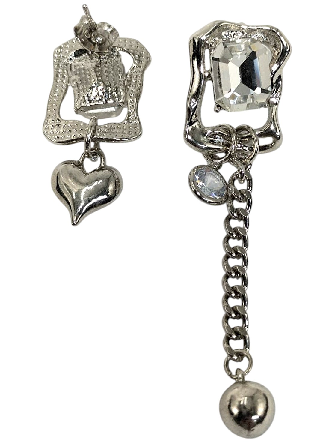 メモ | アイテム:スクエアストーン付きアシンメトリーデザインピアス・ハート付きピアス 素材:メタル・ガラス カラー:シルバー・クリスタル 全長:約3.3㎝/約6.3㎝ |
