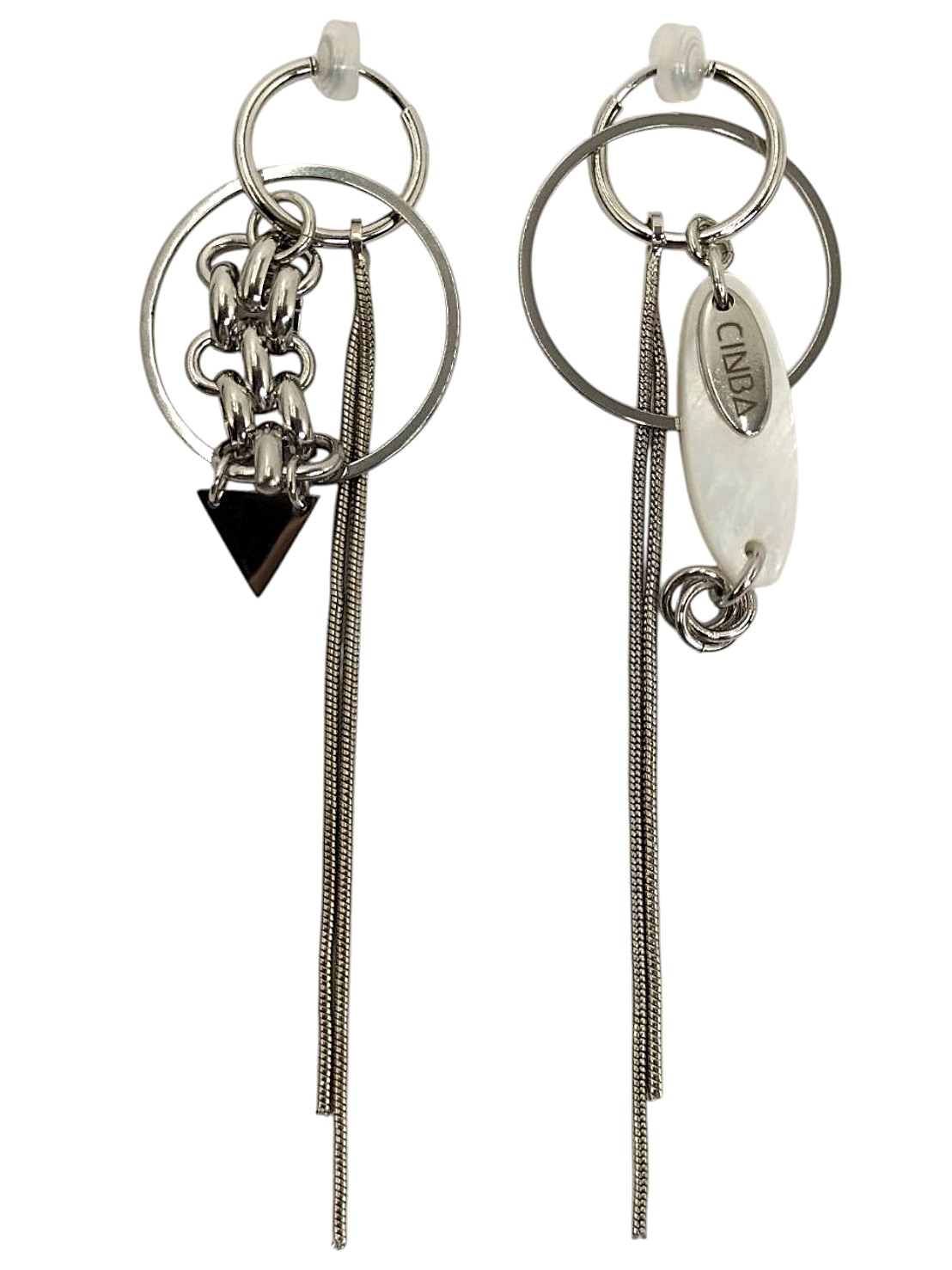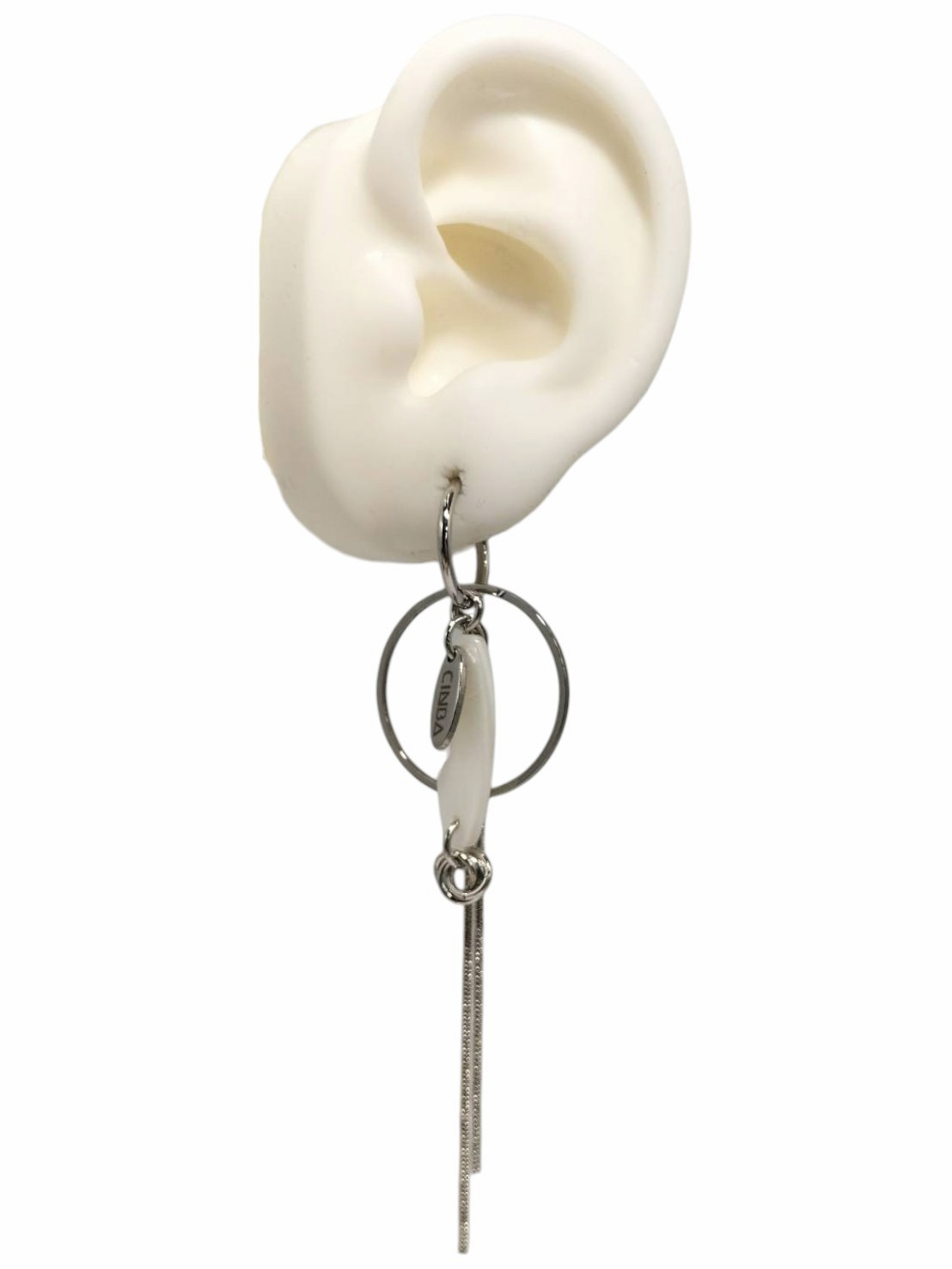 アイテム:ロングモチーフデザインイヤリング 素材:メタル・アクリルパーツ カラー:シルバー・乳白 全長:約8.5㎝~9㎝