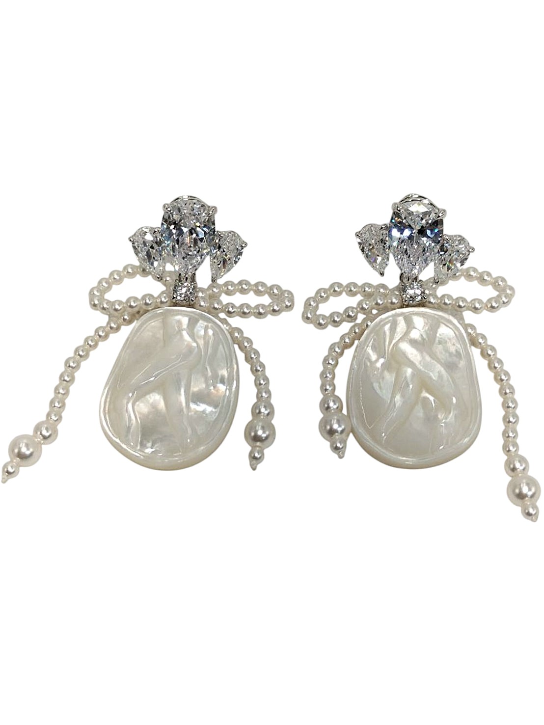 メモ | アイテム:シェルモチーフ&ビジュー付きパールリボンデザインピアス 素材:樹脂パール・ガラス・シェル カラー:ホワイトパール・クリスタル・乳白 |