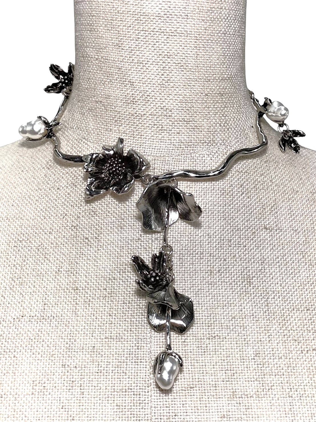 アイテム:変形パール付きメタルフラワーネックレス 素材:メタル・樹脂パール カラー:アンティークシルバー・パールホワイト
