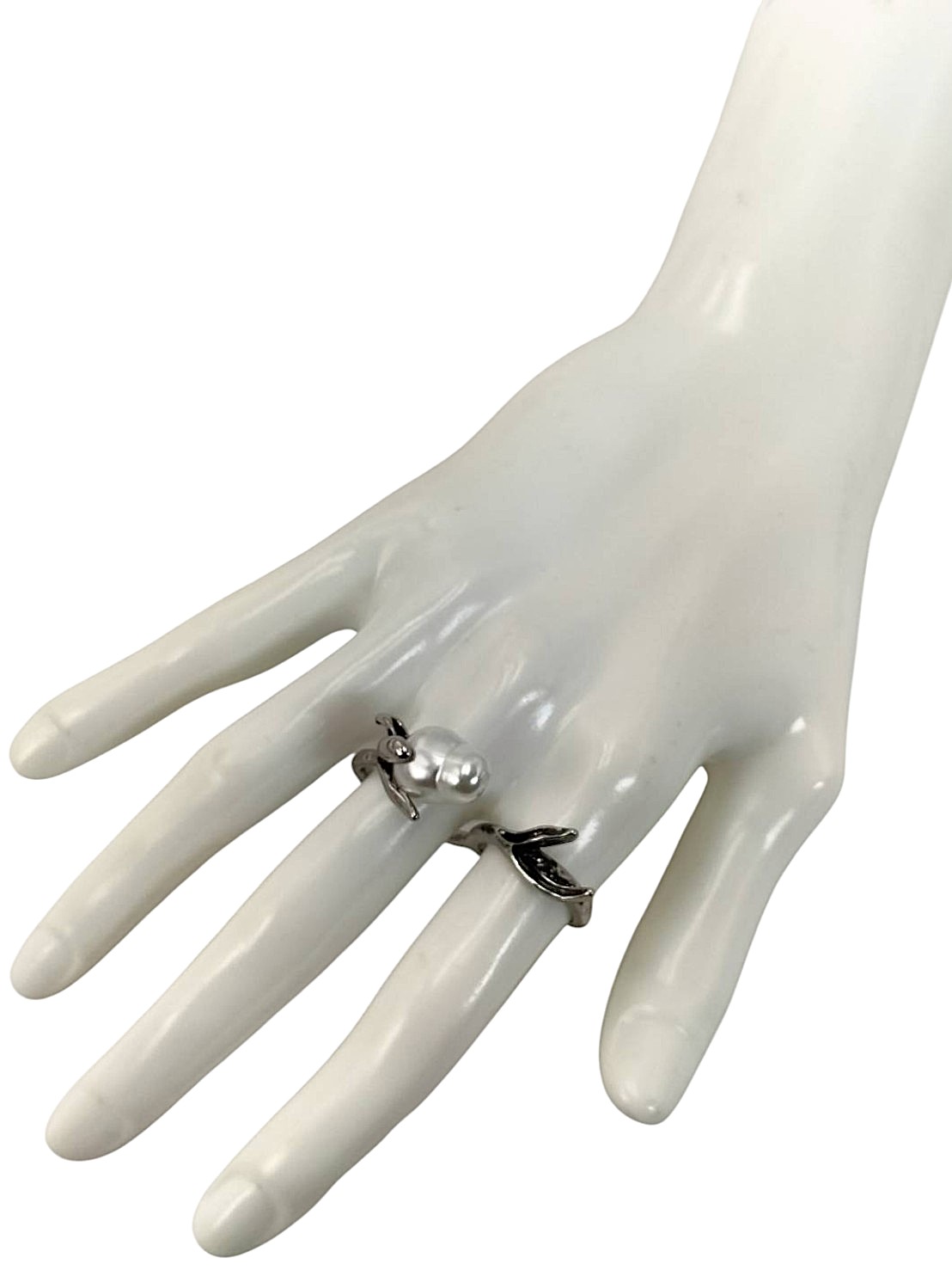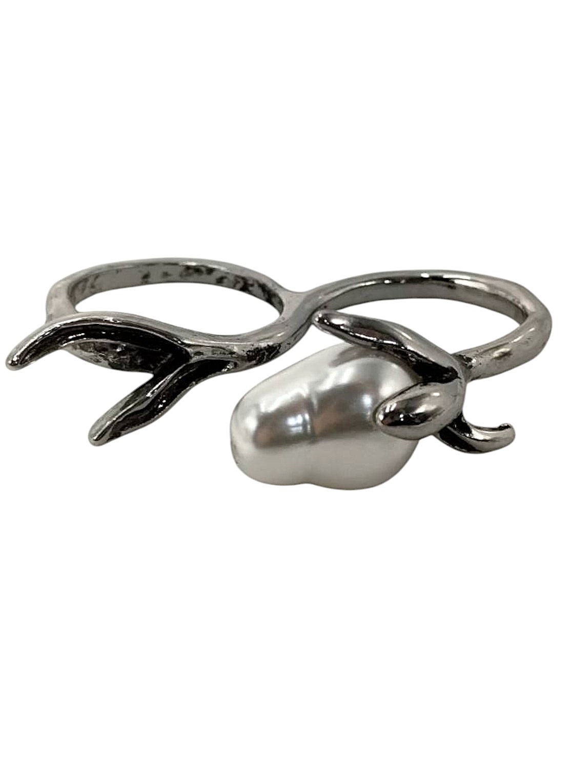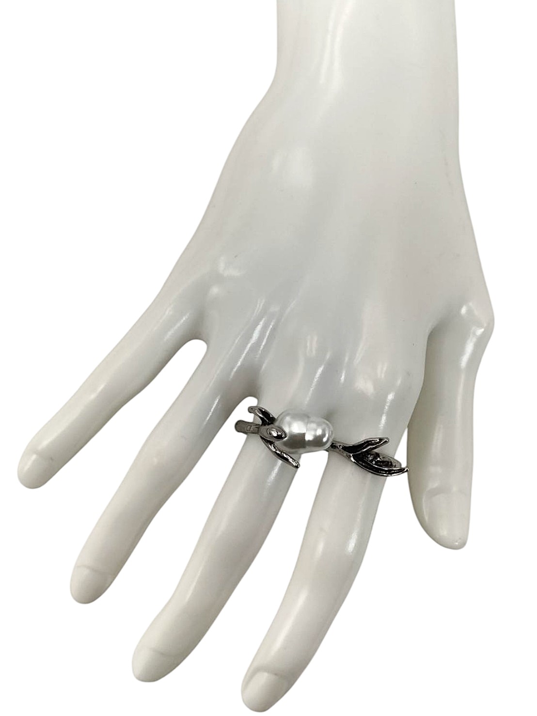 アイテム:変形パール付きメタルフラワーリング 素材:メタル・樹脂パール サイズ:52(12号・16.5 mm・US6・UKL - L1/2) カラー:アンティークシルバー・パールホワイト