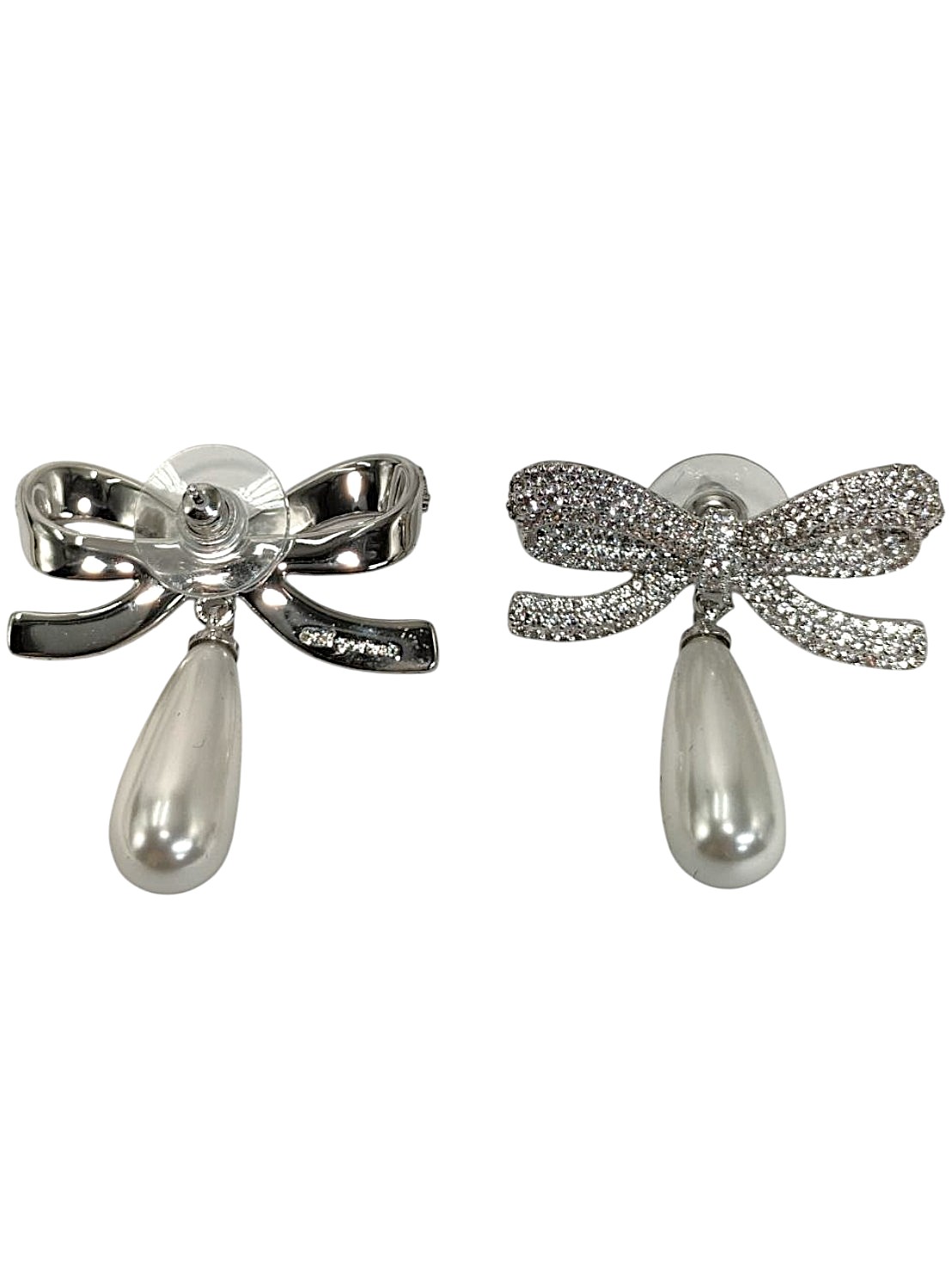 | メモ | アイテム:シルクパール付きリボンデザインピアス 素材:樹脂パール・メタル・ガラス カラー:ホワイトパール・シルバー・クリスタル 全長:約3.8㎝ |