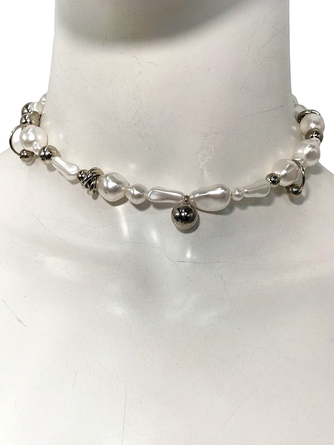 | メモ | アイテム:変形パール&メタルミックスデザインネックレス 素材:メタル・樹脂パール 全長:36㎝ カラー:シルバー・ホワイトパール |