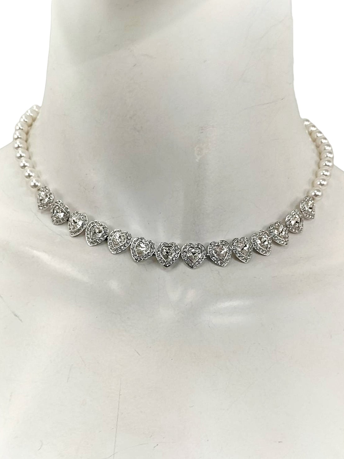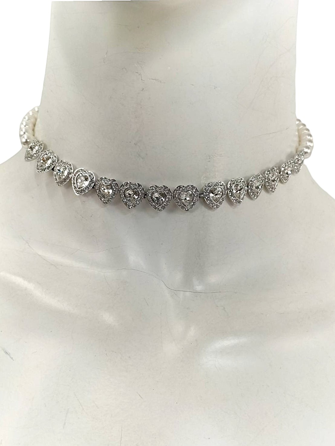 アイテム:パール付きハートストーンデザインチョーカー 素材:メタル・ガラスパール・ガラス 全長:約26㎝(装飾部分) カラー:シルバー・ホワイトパール・クリスタル
