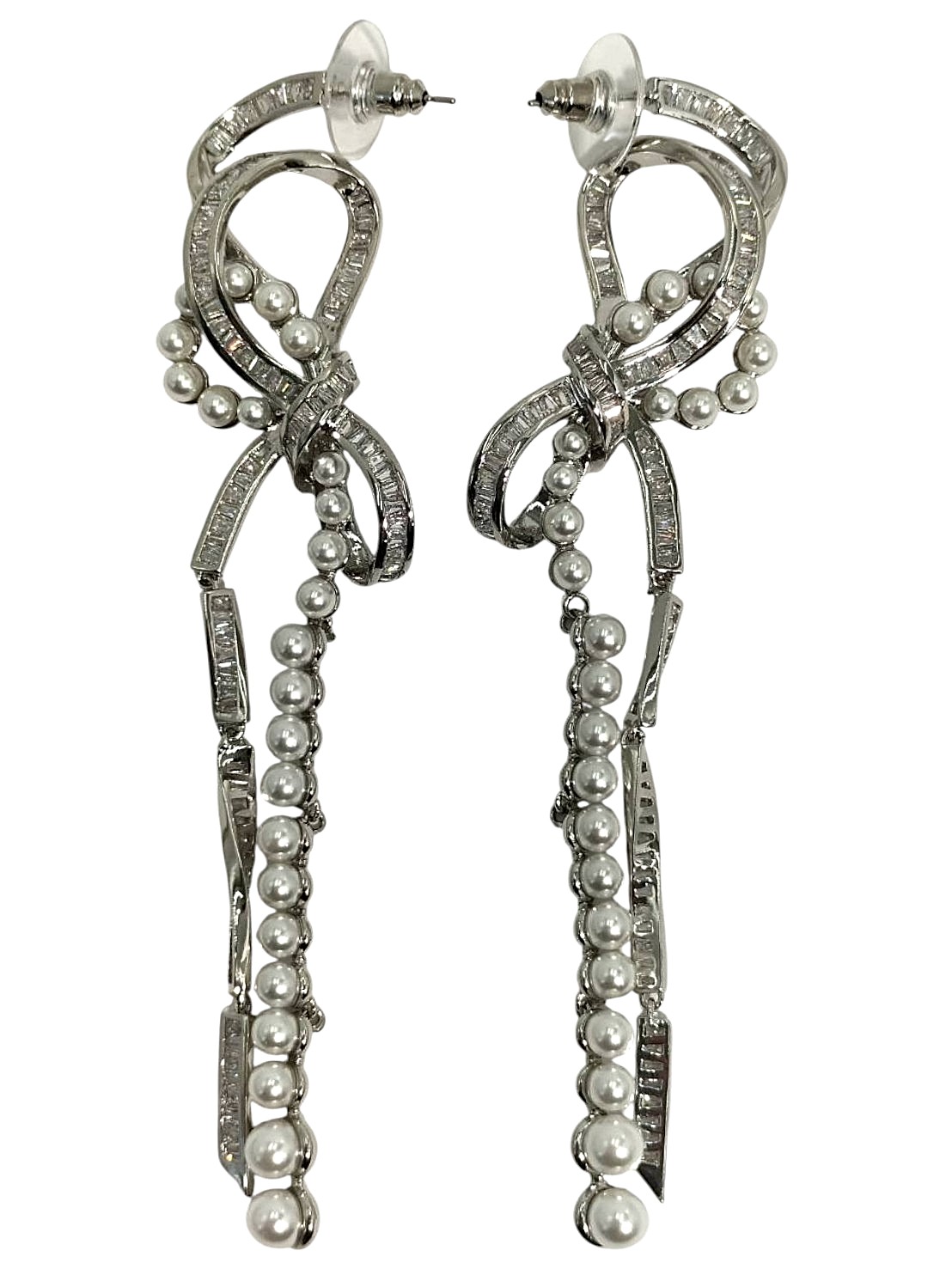| メモ | アイテム:パール付きリボンデザインフリンジピアス 全長:約10㎝ 素材:メタル・ガラス・樹脂パール カラー:シルバー・クリスタル・パールホワイト |