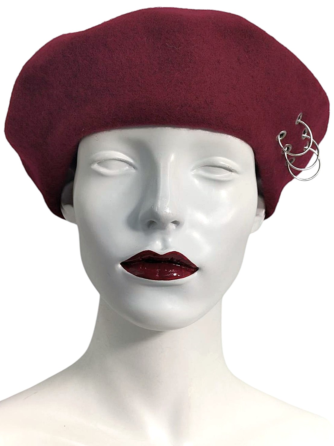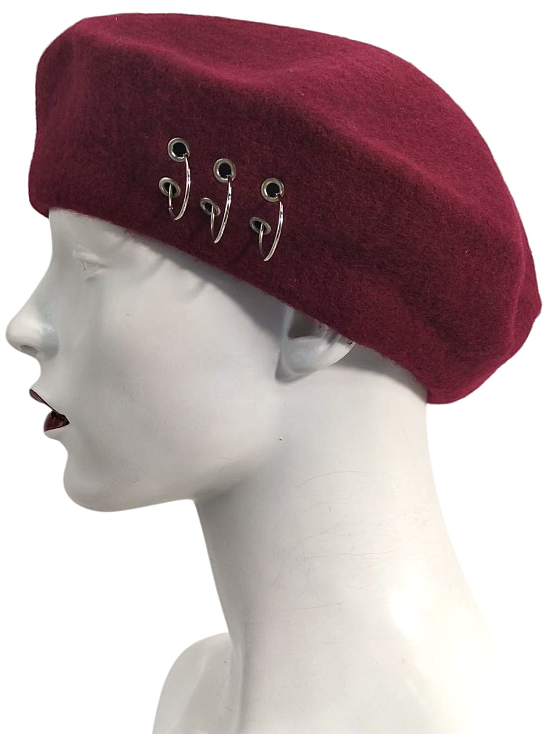 アイテム:メタルチャーム付きベレー帽 素材:ウール・ナイロン・メタル カラー:バーガンディー・シルバー