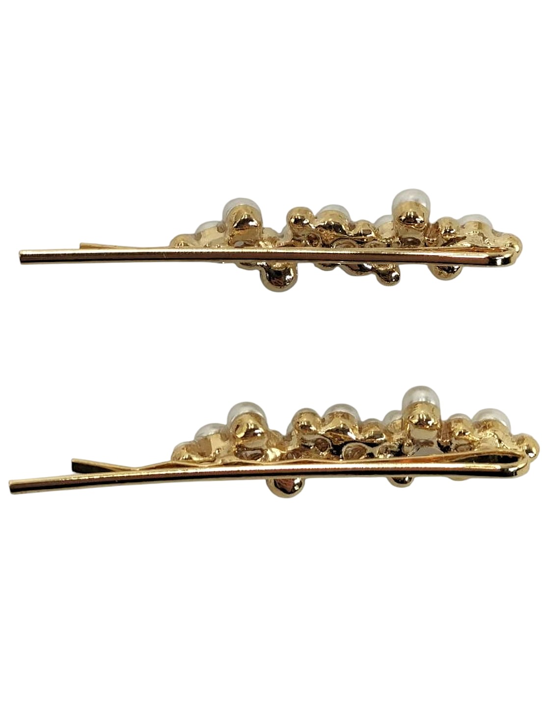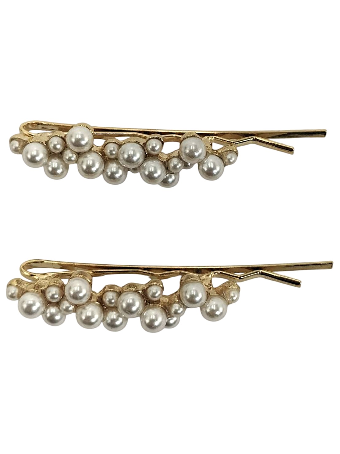 アイテム:パールミックスヘアピン2ヶセット 素材:ガラスパール・メタル カラー:ゴールド・ホワイト 全長:約3.5㎝(装飾部分)