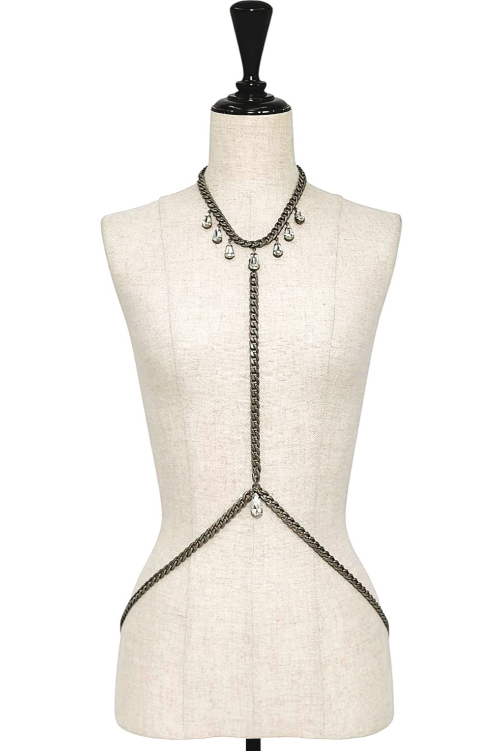 | メモ | アイテム:ビジュー付きボディーアクセサリー・ボディーチェーン・チェーンハーネス 素材:メタル・ガラス カラー:アンティークシルバー・クリスタル |