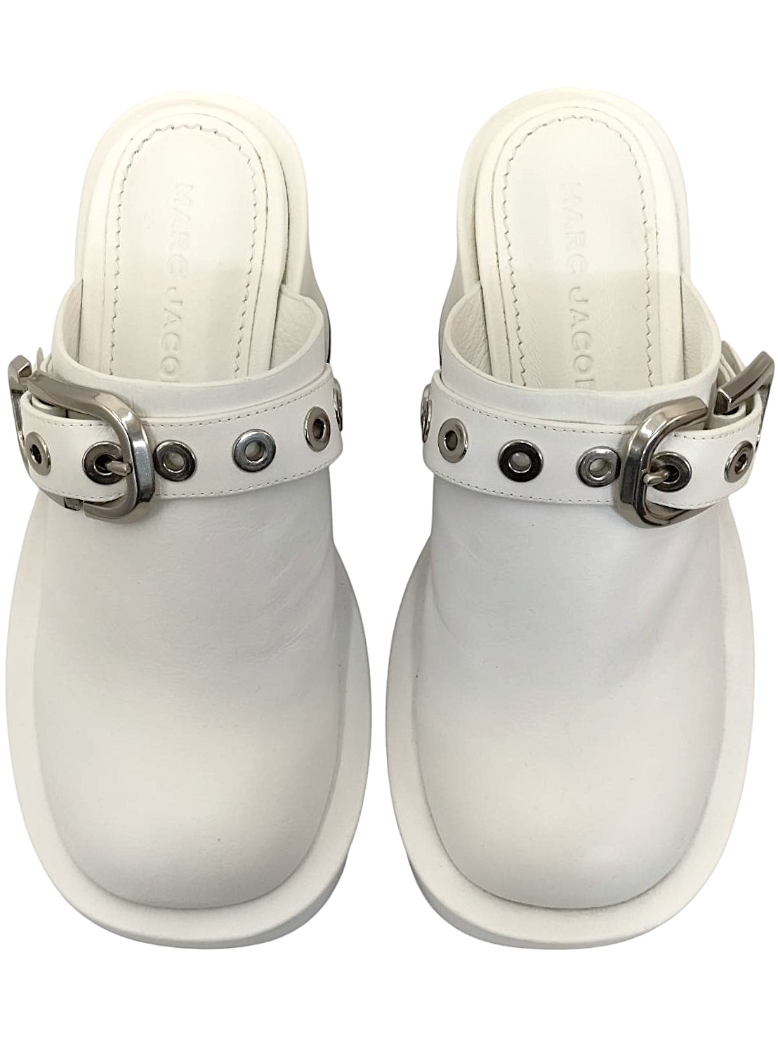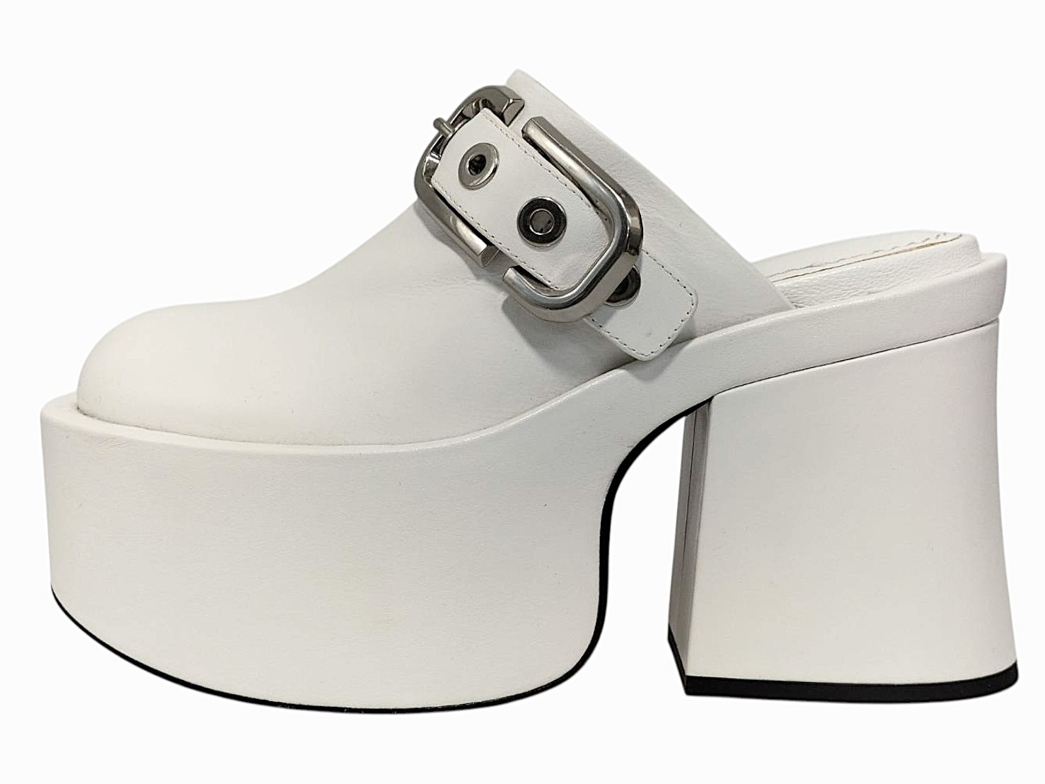 | メモ | アイテム: クロッグサンダル・サボサンダル(プラットフォームあり) 素材:レザー・メタル ヒール:約11cm ストーム(前):6.5cm カラー:ホワイト・シルバー |