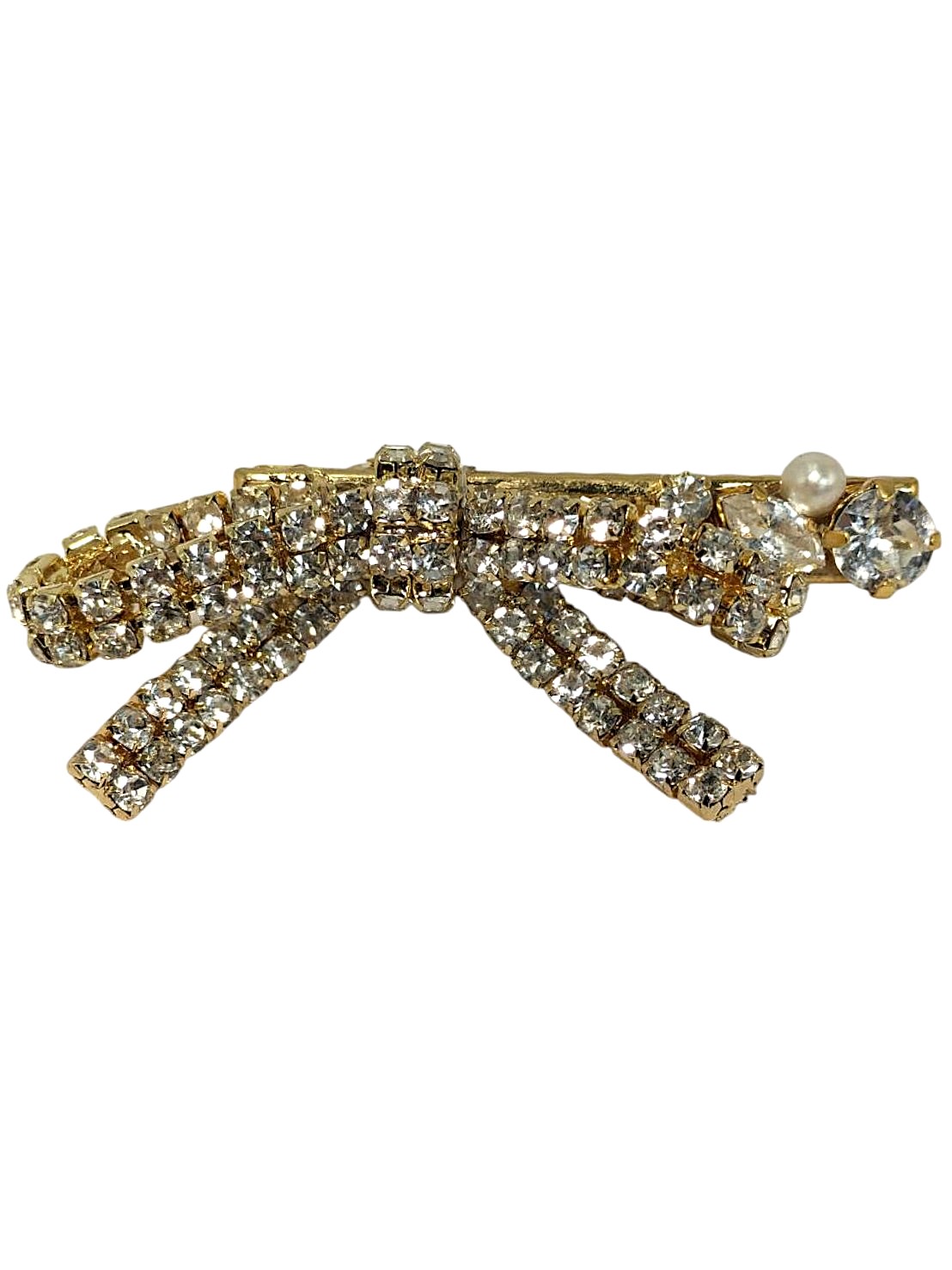 アイテム:リボンビジュー付きヘアクリップ 素材:ガラス・メタル・樹脂パール カラー:クリスタル・ゴールド・キスカパール 全長:約7㎝ 幅:約3㎝