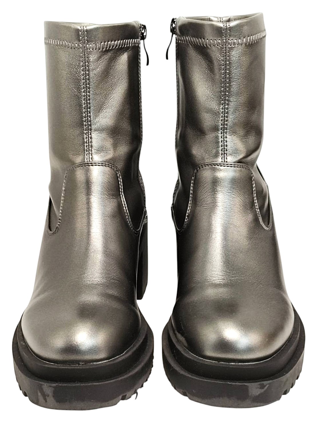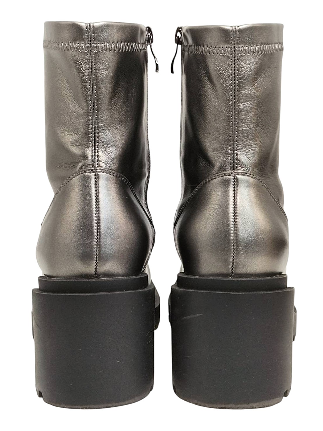 アイテム:プラットフォームショートブーツ 素材:フェイクレザー サイズ:L(24~24.5cm) ヒール:約8㎝ ストーム(前):約3cm 全長:約24㎝ カラー:メタリックグレー