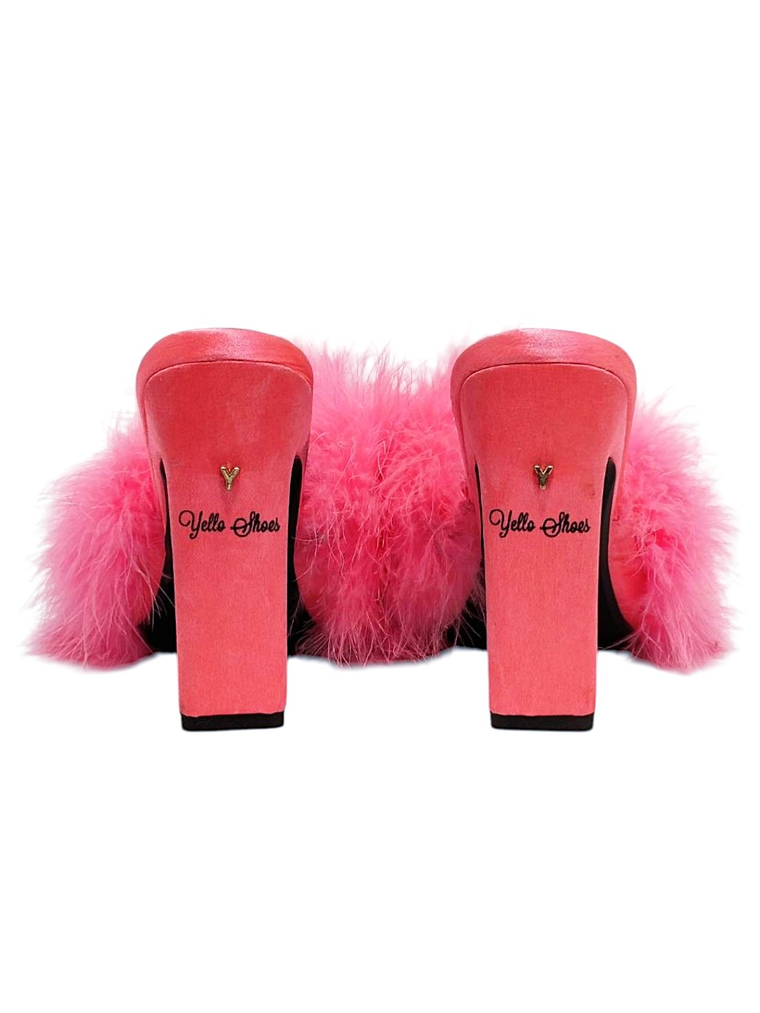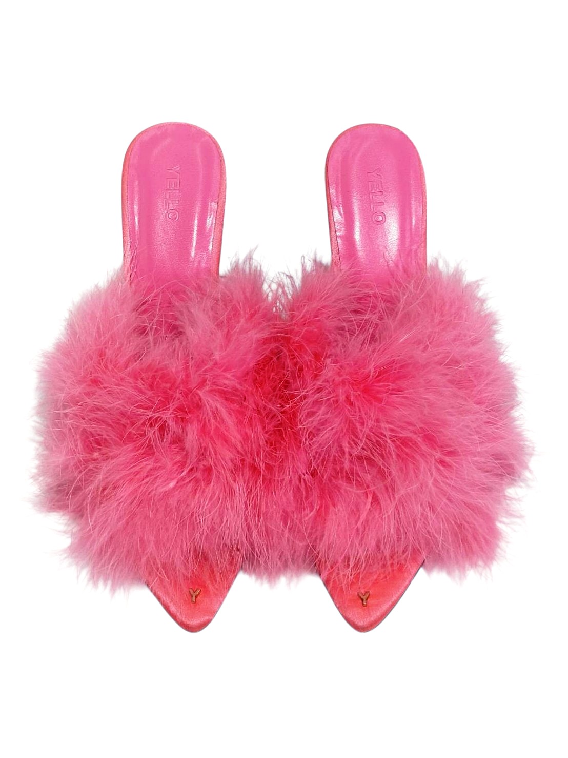 アイテム:フェザー付きミュールサンダル 素材:フェザー・サテン生地 サイズ:XL(25~25.5cm) ヒール:約11.5㎝ カラー:ネオンピンク ※内側黒い汚れあり