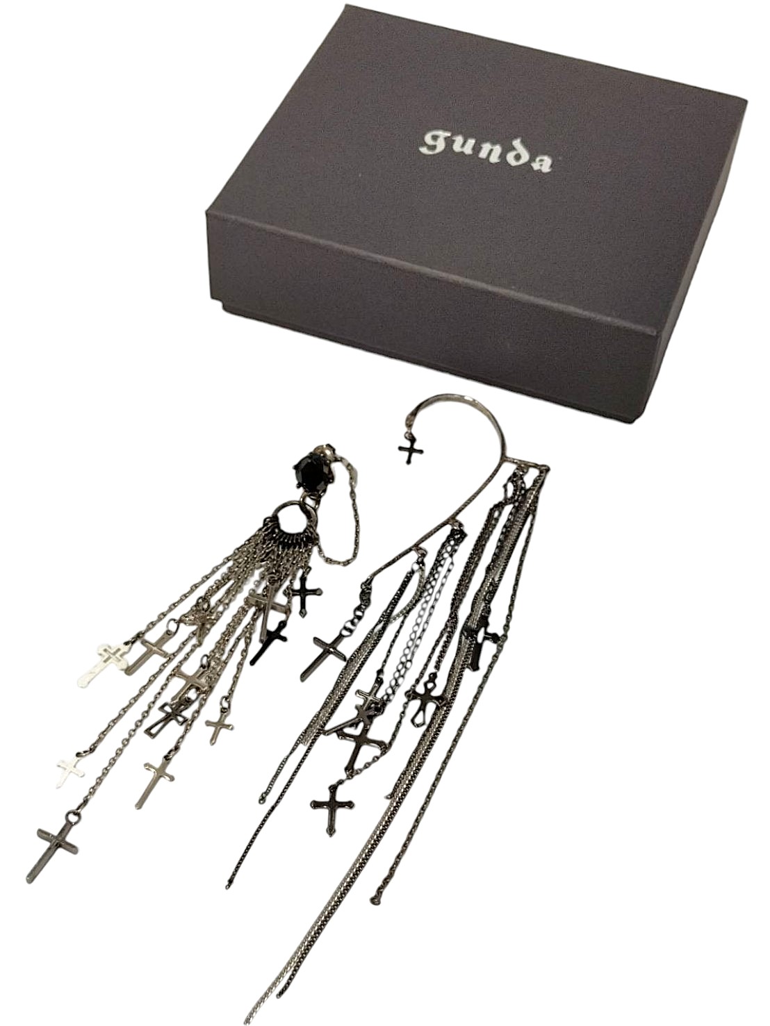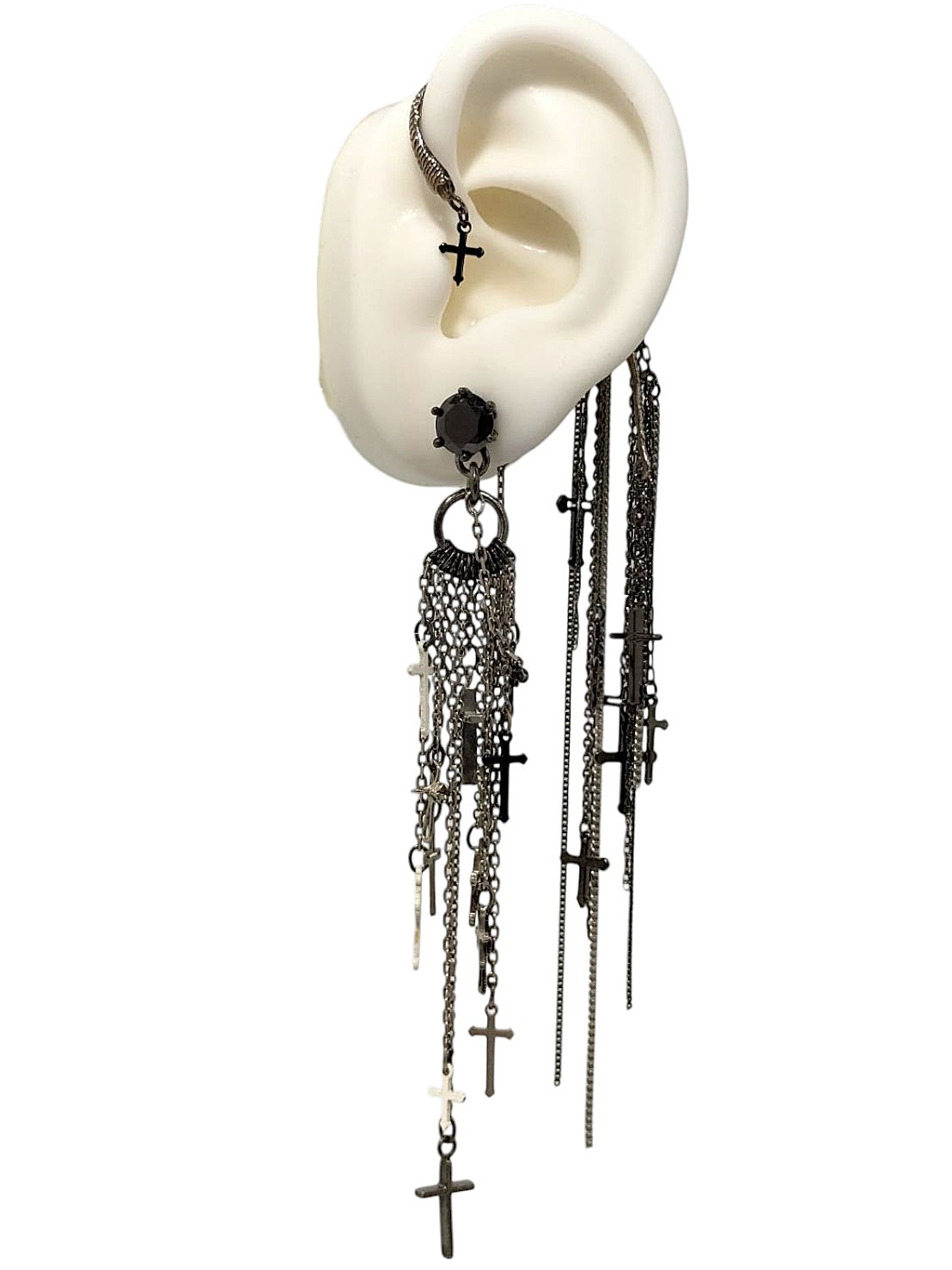 アイテム:クロスモチーフ付き片耳ピアス&イヤーカフ 素材:メタル・ガラス カラー:ブラックニッケル・アンティークシルバー・アイボリー・ブラック