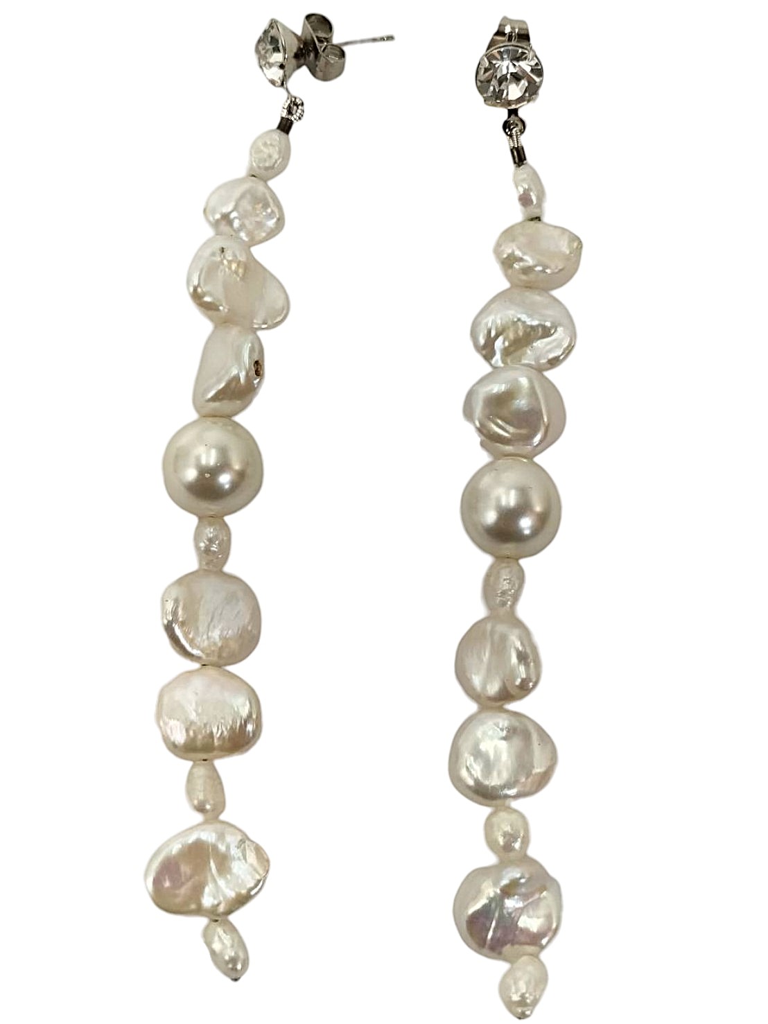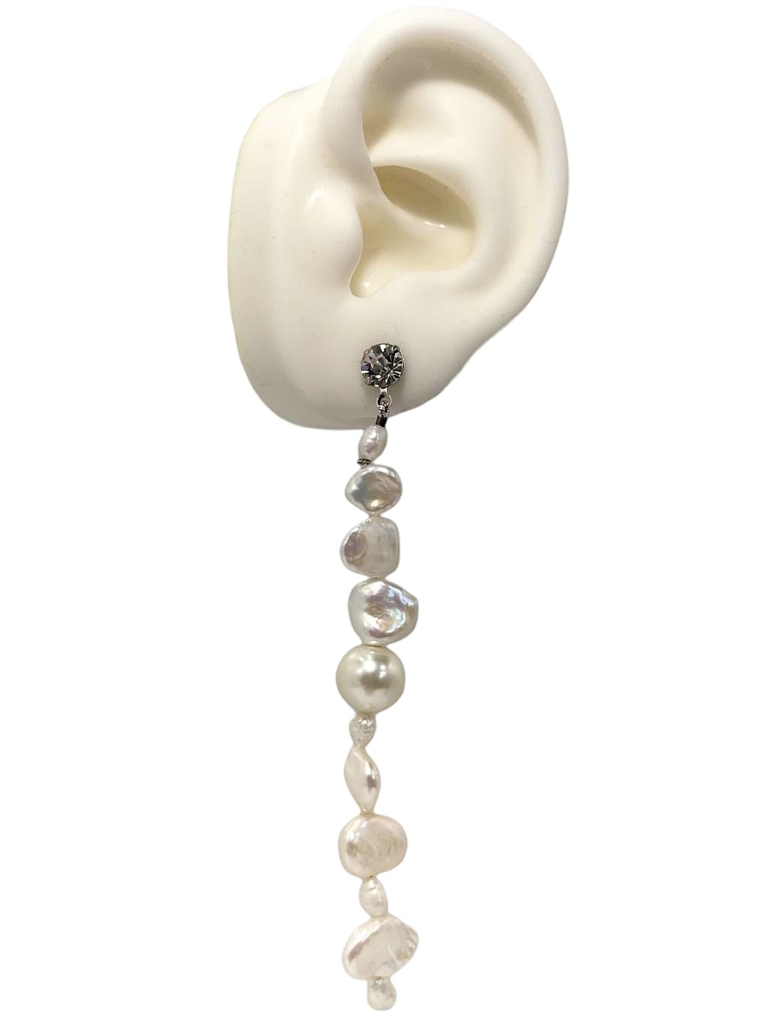 | メモ | アイテム:淡水パールロングピアス 素材:メタル・ガラス・淡水パール カラー:シルバー・クリスタル・ホワイトパール 全長:約9.5㎝ |