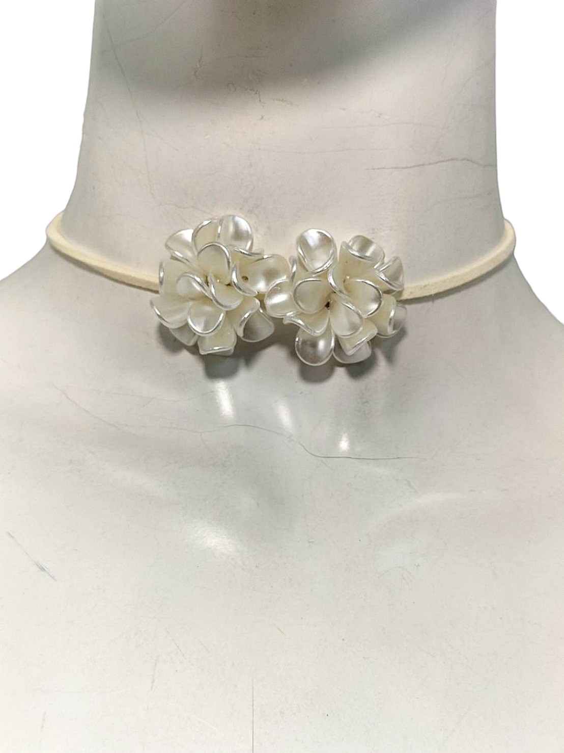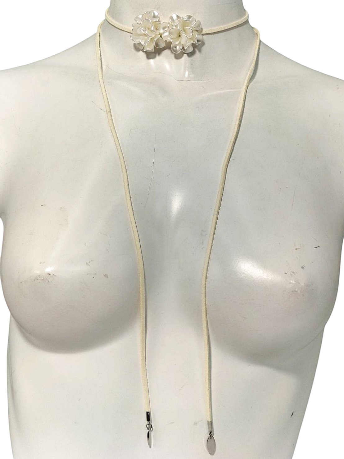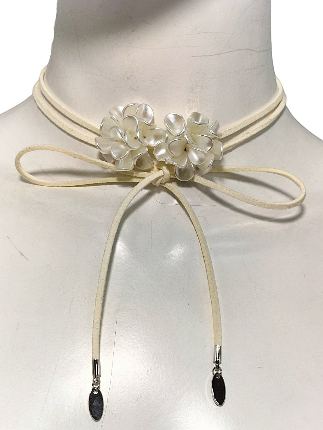 アイテム:フラワーモチーフ付きチョーカー 素材:メタル・スエード紐・アクリルパーツ 1モチーフ全長:約3㎝ カラー:アイボリー・シルバー